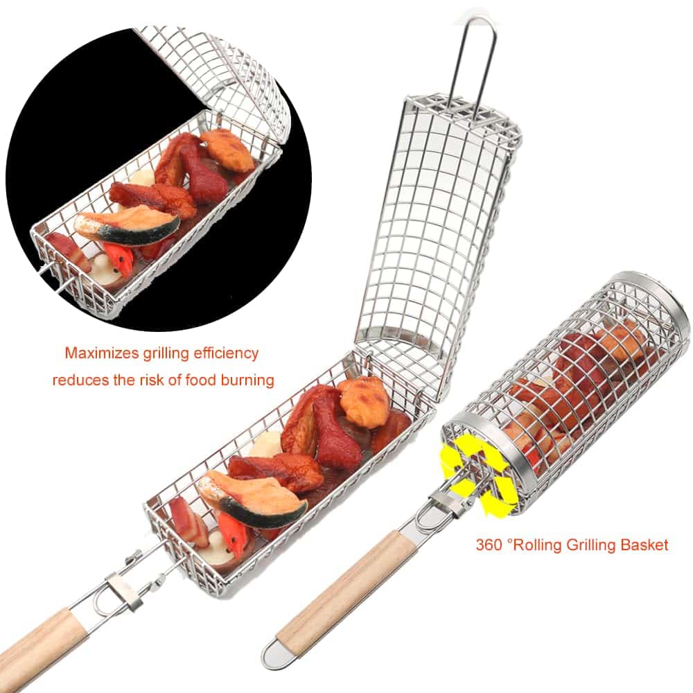 4. Diseño Compacto: El mango de la parrilla rodante de acero inoxidable se puede anidar en la parrilla para un fácil almacenamiento cuando no se usa.