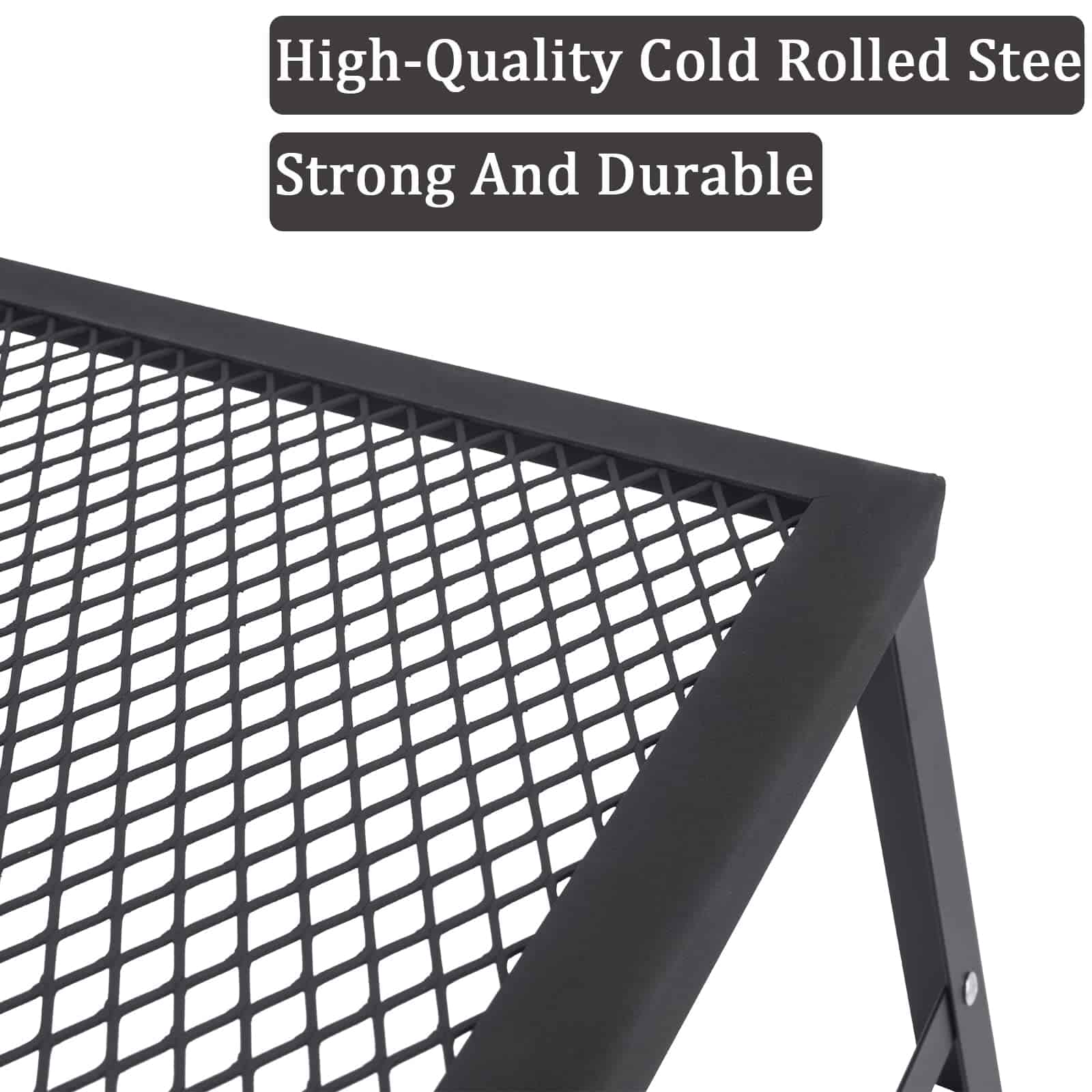 3. Material de Alta Calidad: La rejilla de parrilla para fogata está hecha de acero laminado en frío de alta calidad, resistente y duradero. La superficie de la rejilla de parrilla para fogata está recubierta con un proceso de barnizado de alta temperatura, haciéndola resistente al óxido y al calor. La parrilla para camping presenta una rejilla de acero con forma de diamante en la parte superior, que permite que el calor fluya desde una fogata abajo. Ideal para barbacoas al aire libre.