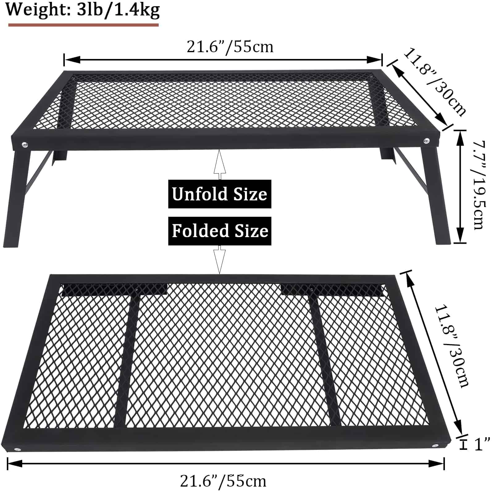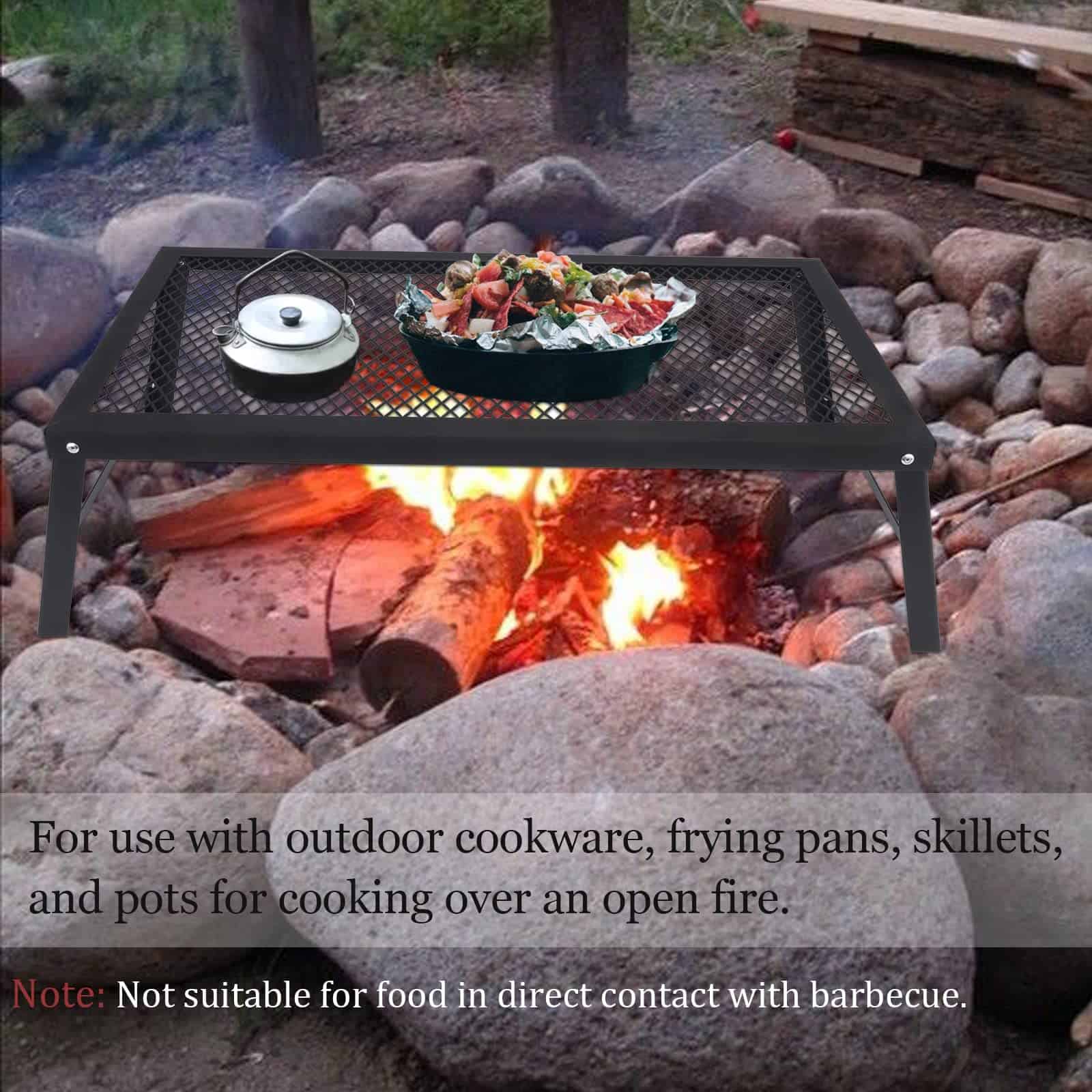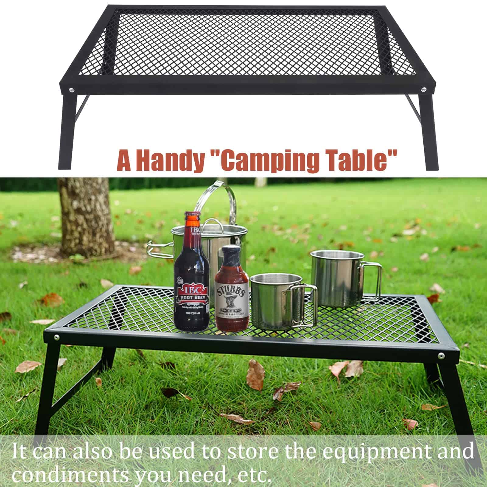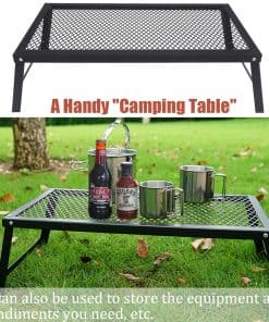 2. Fuerte Rejilla de Campamento: La parrilla de campamento puede servir como una práctica «mesa de camping» para guardar el equipo alrededor de tu campamento. La rejilla de cocinar sobre fogata también se puede colocar como una rejilla de parrilla, así como un soporte de estufa para quemar sobre tu fogata abierta para cocinar. Ten en cuenta que no es adecuada para parrillas de contacto directo.