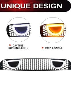 4. Luces multifuncionales: La parrilla mach1 con luz DRL redonda súper blanca con luces direccionales de color ámbar; Esto no solo mejora la apariencia y el rendimiento del automóvil; también mejora la seguridad al agregar una mejor visibilidad del automóvil durante el clima con niebla.