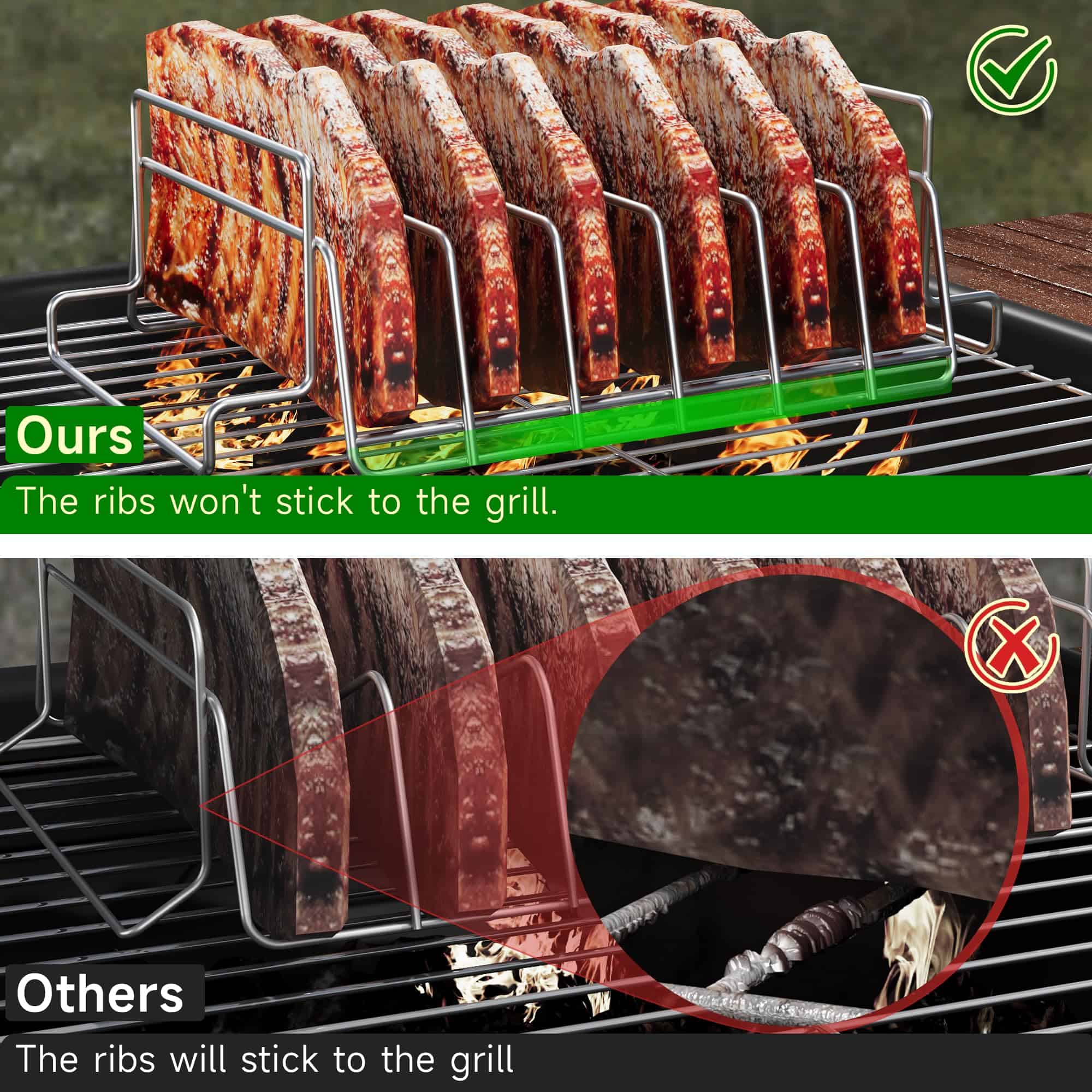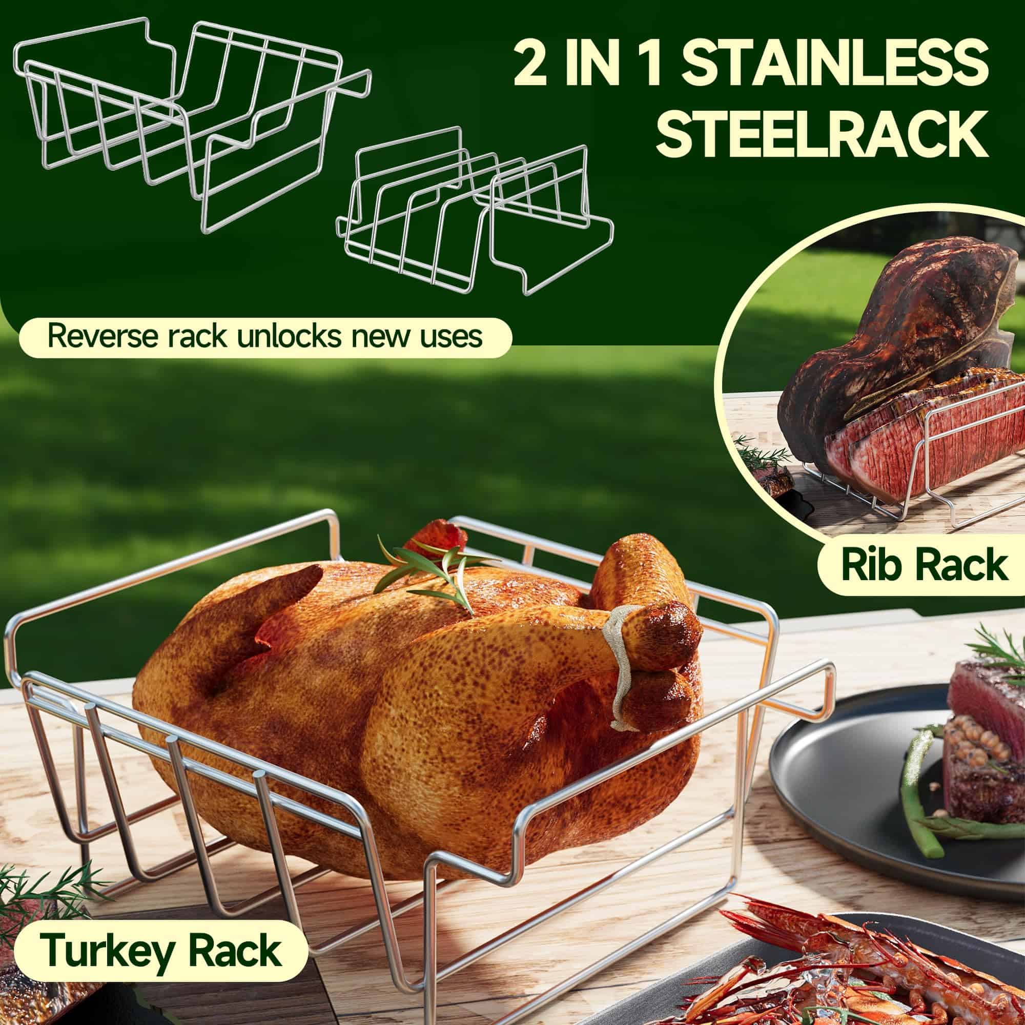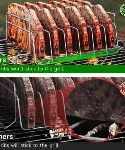 3. Parrilla para Costillas 2 en 1 de Pavo: La parrilla para costillas BBQ para ahumar adopta un diseño único 2 en 1. Un lado se puede utilizar para ahumar y asar pavo. ¡Dale la vuelta y puedes usar el otro lado para hacer costillas! Este diseño te permite utilizarlo para múltiples fines y ahorrar dinero.