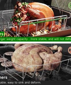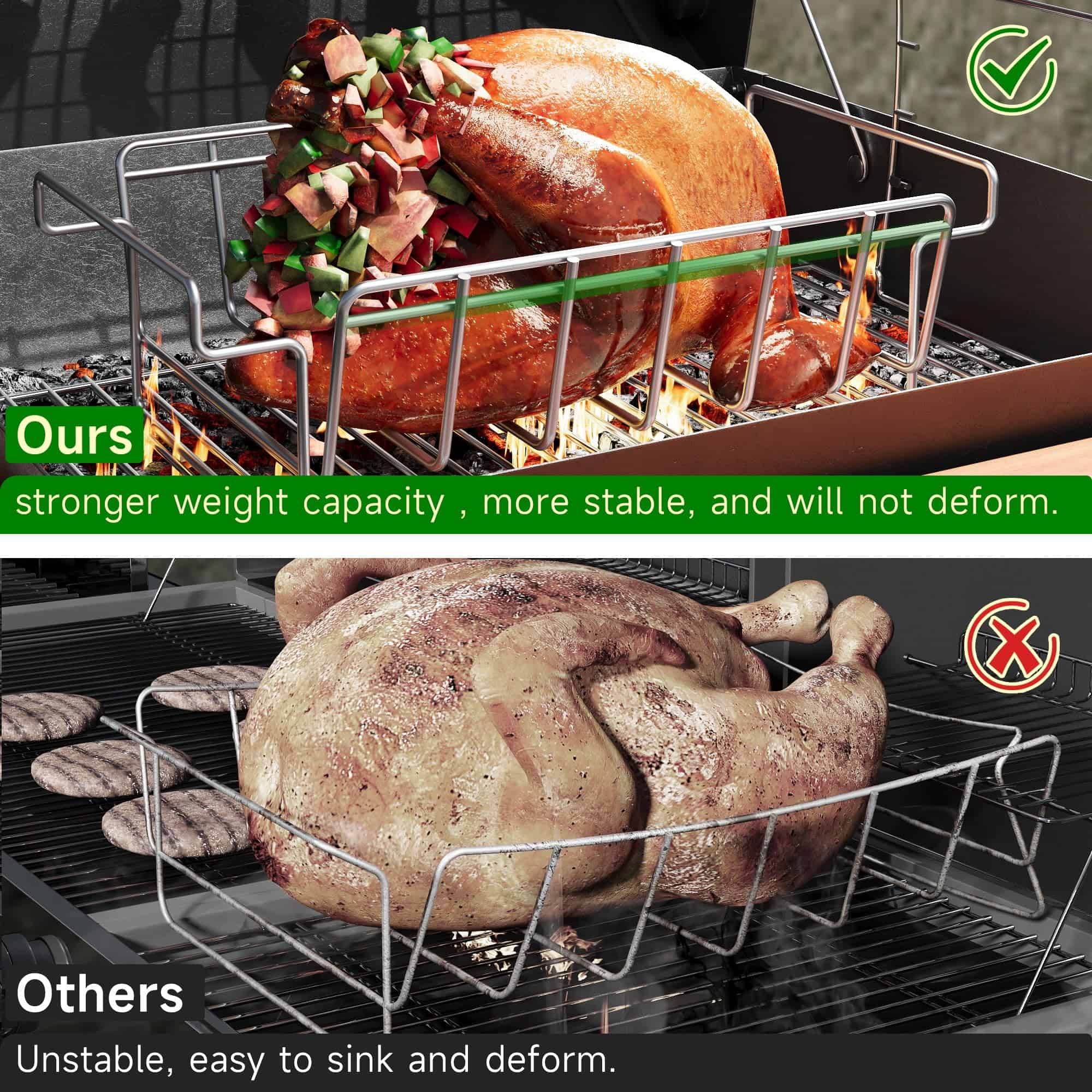 1. Parrilla para Asar Pavo Mejorada: En cuanto a la estructura del producto, la parrilla para asar pavo de LOCVCDA es diferente a las parrillas de pavo ordinarias. Es más estable y tiene una capacidad de carga más fuerte que las parrillas comunes, y no se hundirá.