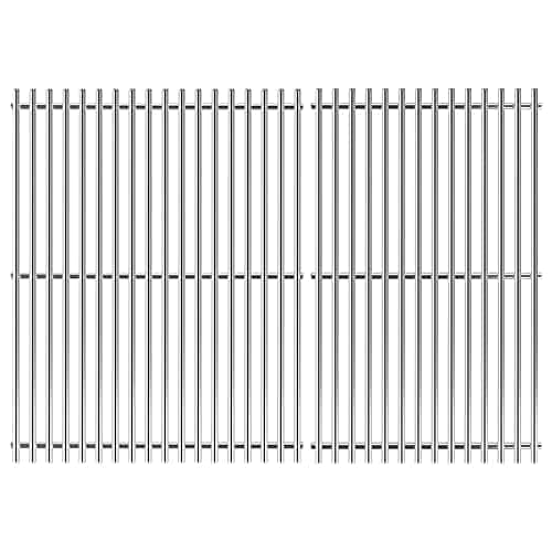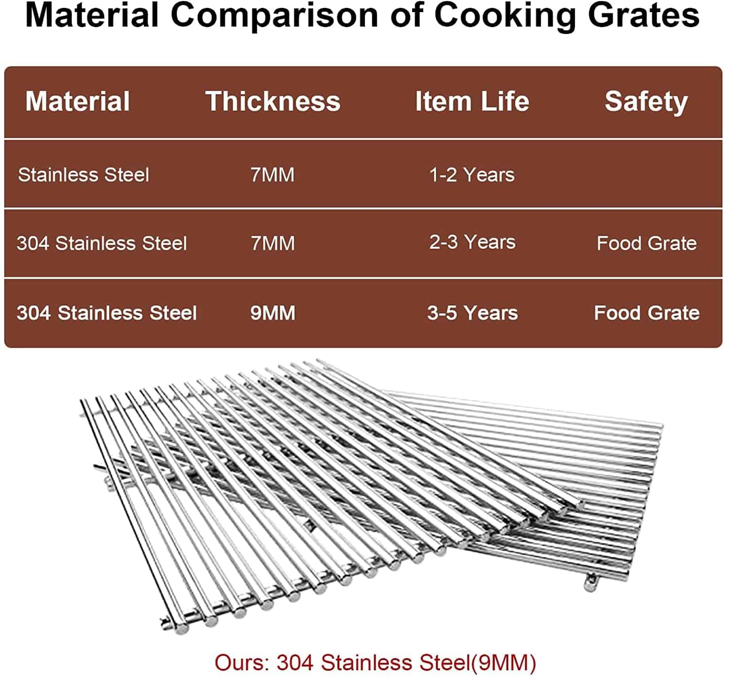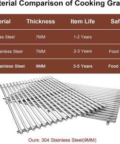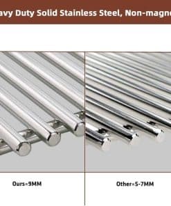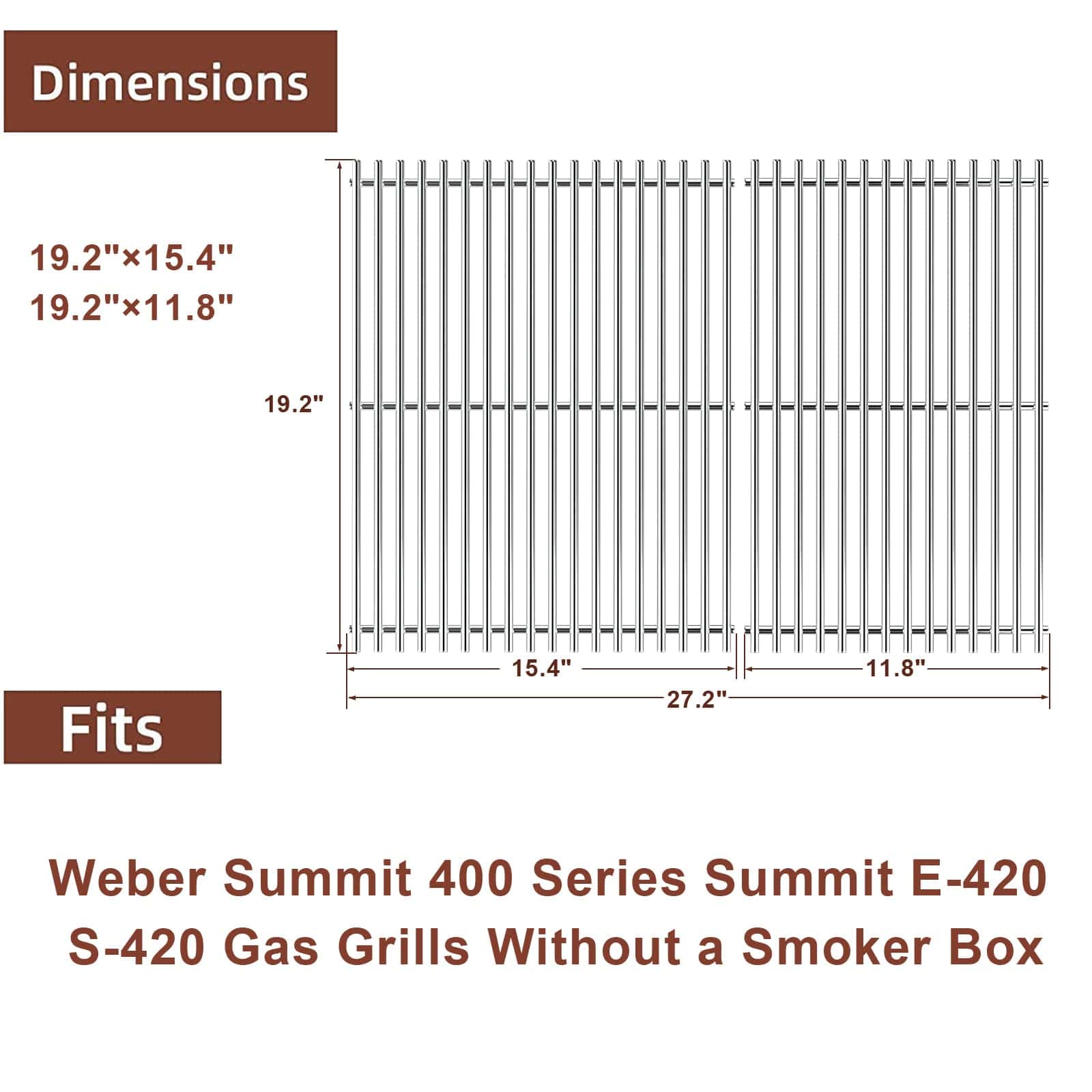 Parrillas de cocina de acero inoxidable SUS304 / 9MM para parrillas de gas Weber Summit 400 Series Summit E-420 S-420 sin caja de ahumador. Este juego de 2 rejillas se ajusta perfectamente a las parrillas Weber Summit 400 Series Summit E-420 S-420 sin caja de ahumador, brindando una superficie de cocción más grande para su comida. Las rejillas tienen 18 barras en cada rejilla, lo que las hace más gruesas que las de otros vendedores y evita que caigan alimentos pequeños a través de la rejilla. Además, las marcas de sellado en las rejillas ayudan a retener y distribuir el calor de manera más eficiente, creando sears profesionales en su comida. El resistente empaque protege las rejillas contra cualquier daño durante el transporte y las convierte en un excelente regalo para otros entusiastas de la parrilla. Estas rejillas son fáciles de limpiar, ya que están libres de bordes afilados y tienen una superficie lisa y antiadherente. Simplemente lávelas con agua jabonosa para una limpieza fácil y sin problemas.