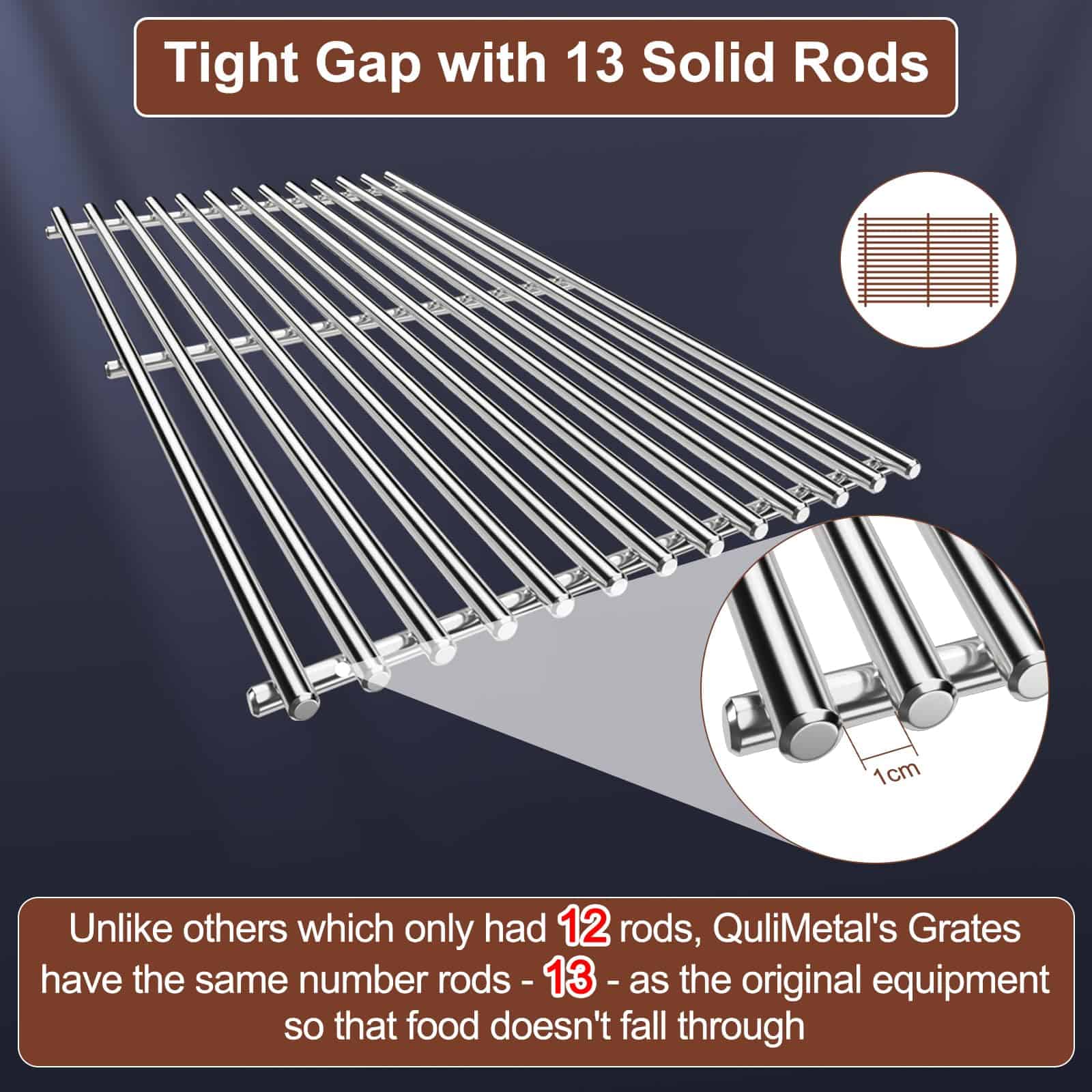1. COMPATIBILIDAD Compatible con la serie Weber Spirit 200 (Control Frontal), incluyendo parrilla de gas E/S-210, E/S-220 (2013-2017). También es compatible con la parrilla Weber GS4 Spirit II 200 Series (Control Frontal), incluyendo Spirit II E/S-210, E/S-220 (2017 en adelante). 2. DIMENSIONES Y PAQUETE 17.5 x 10.2 pulgadas para cada parrilla, 17.5 x 20.5 pulgadas en total. Viene con 2 parrillas de parrilla de acero inoxidable 304. Por favor, compara con el TAMAÑO y MODELO de tus piezas originales antes de ordenar. 3. ACERO INOXIDABLE 304 Hecho de acero inoxidable 304 resistente y duradero. No magnético, resistente a la corrosión y resistente al calor. 4. DIÁMETRO DE BARRAS SÓLIDAS 7MM El grosor es de 7MM, más grueso que otras parrillas de 5MM. Las parrillas de QuliMetal cuentan con barras sólidas de acero inoxidable 304, que no son fáciles de deformar y son más duraderas para un uso prolongado.