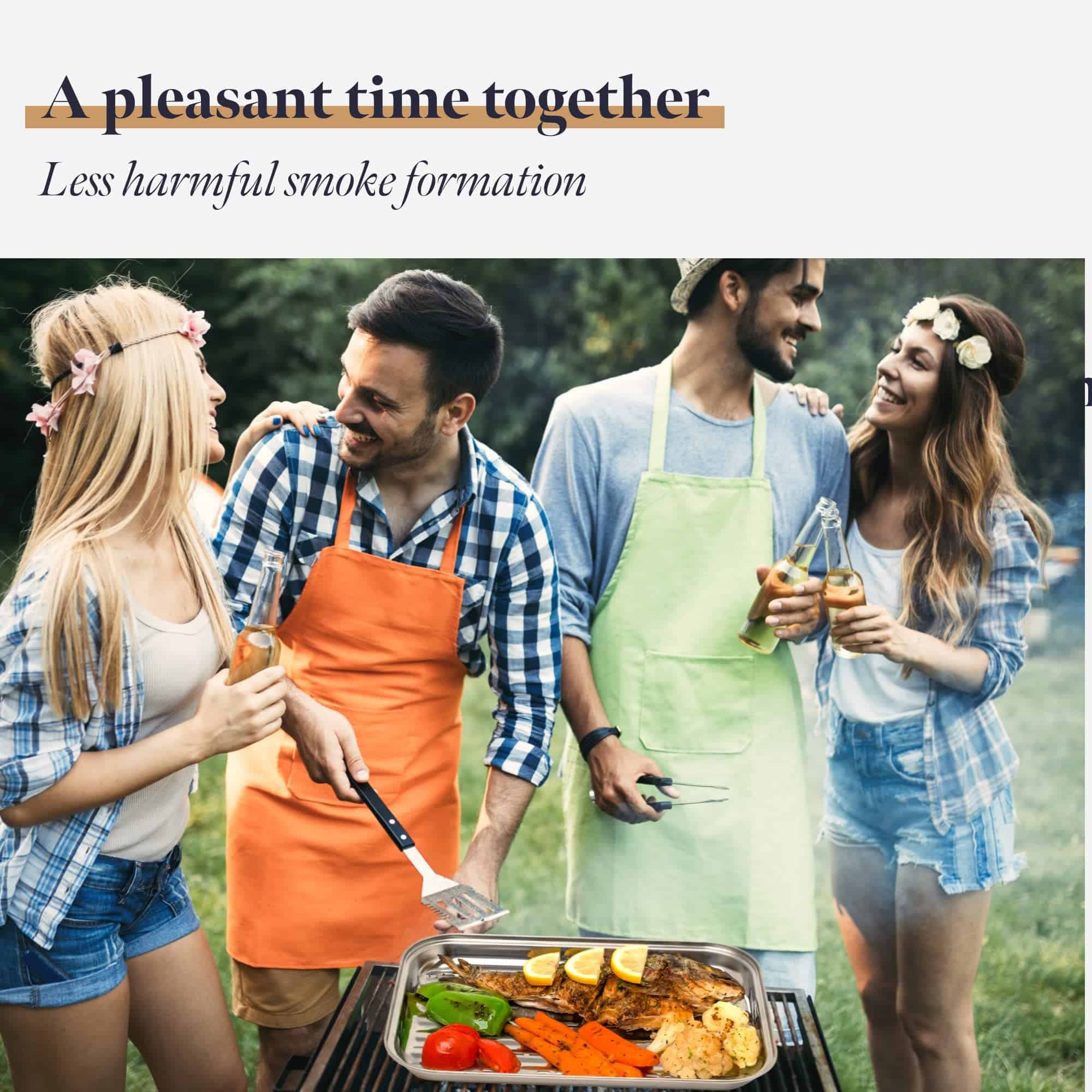 1. Acero Inoxidable Sostenible: Nuestro set de 2 parrillas para barbacoa GOURMEO está hecho de acero inoxidable de alta calidad SS430. Puede ser reutilizado muchas veces en comparación con modelos de aluminio de un solo uso. Perfecto para disfrutar de esas sesiones semanales de barbacoa de verano.