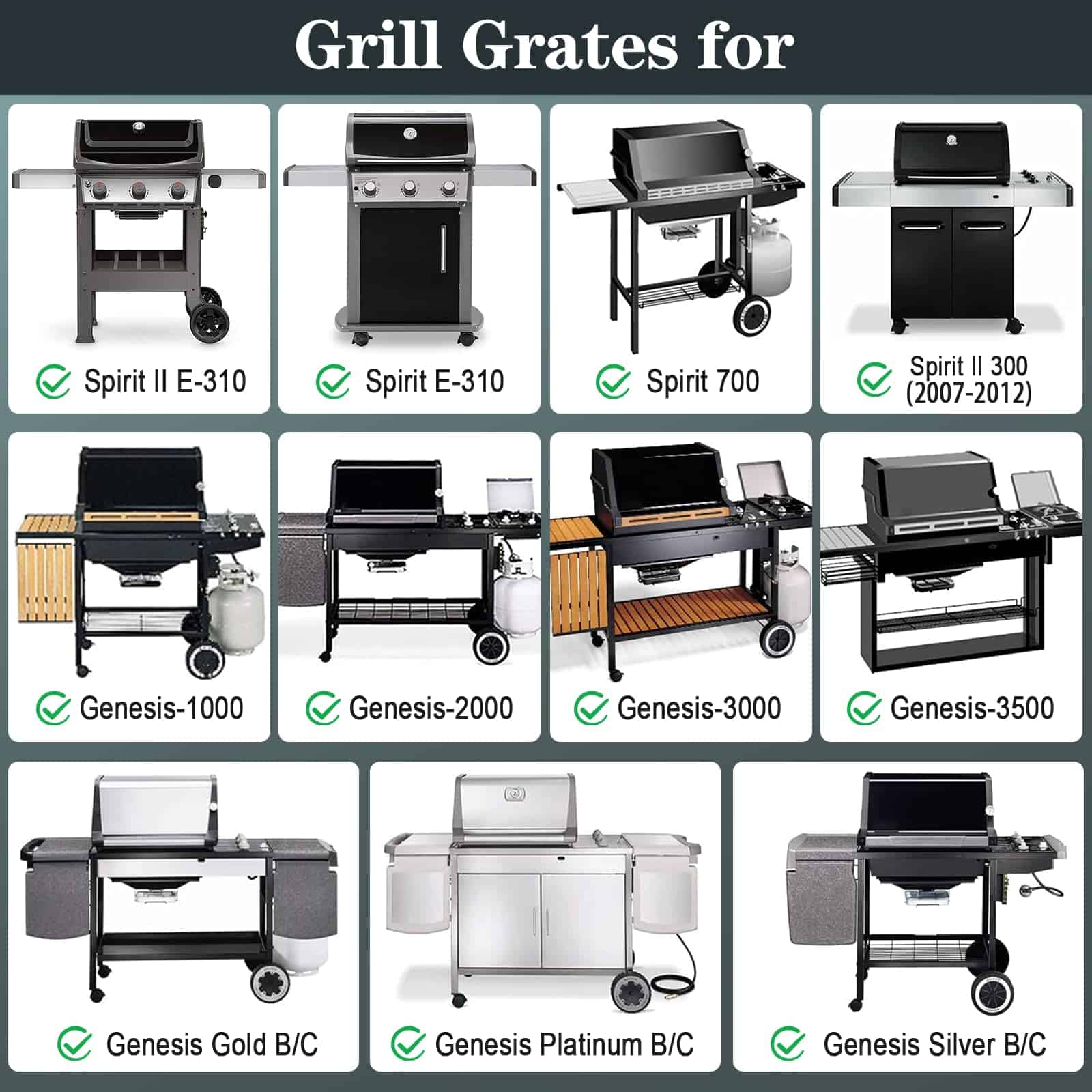 3. Se ajusta a la parrilla de gas Weber Genesis Las parrillas de cocción se ajustan a Weber Genesis Silver B & Genesis Silver C, Genesis Gold B & Genesis Gold C (2002+), Genesis I-IV, Genesis 1000-3500, Genesis Platinum I & II, Genesis Platinum B/C (2000 – 2010) parrilla de gas. Piezas de parrilla weber genisis para Weber 65619 65906, 7011, 7012, 7525, 7526, 7527.