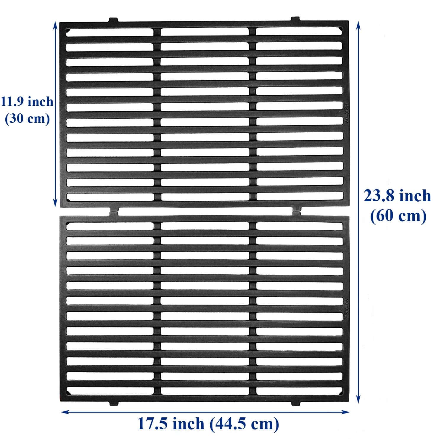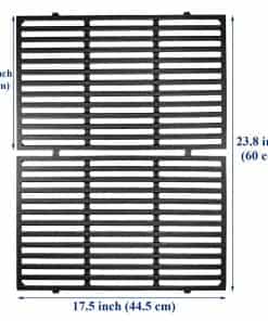 5. Dimensiones y Material Las parrillas Spirit II 300 GS4 miden 17.5 x 11.9 pulgadas por parrilla, 17.5 x 23.8 pulgadas para dos unidades. Hechas de hierro fundido resistente, nuestras parrillas son más gruesas y duraderas que otras marcas, asegurando un uso duradero. Además, las parrillas de alta calidad hacen que los filetes sean más jugosos y tengan una hermosa marca de sellado.