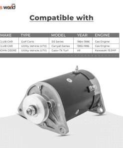 PARTS WORLD USA ofrece un generador de arranque de 12V de alta calidad para Club CAR DS Carros de golf. Este starter generator es compatible con varios modelos y marcas, como CLUB CAR Carros de golf Serie DS (1984-1996), CLUB CAR Serie Carryall (1992-1996), JOHN DEERE Gator TX Turf Kawasaki 15.5HP, CARGO, ARROWHEAD, MANDO, REMY SMALL MOTOR, DIXIE, LESTER, y más. Viene con una garantía de 1 año y un servicio al cliente dedicado. ¡Haz que tus carros de golf corran suavemente y más rápido con nuestro generador de arranque de alta calidad!