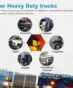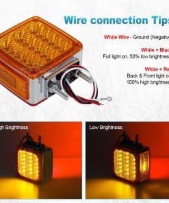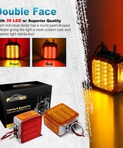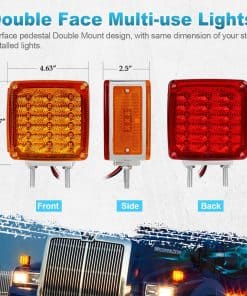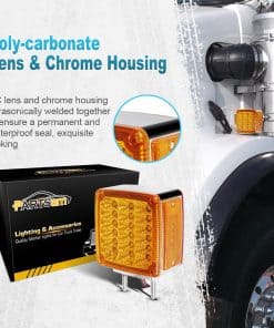 Especificaciones: – Luz de Parada Doble Cara Montada en Pedestal LED – Función: Parada/Giro/Cola/Estacionamiento/Freno/Lámpara y Luz de Marcador Lateral – Se Adapta a: Camión, Autobús, Remolque, Tractor, Excavadora, Camioneta, Buldócer, Grúa, etc. – Voltaje: DC12V – Color: Rojo + Ámbar – Material: Lente de PC (Policarbonato) y Carcasa Cromada – Tamaño: 4.60″ x 4.50″ x 2.50″ Conexión de 3 Cables: – Cable Blanco – Negativo – Blanco + Negro: Todas las luces encendidas al 50% de brillo bajo. – Blanco + Rojo: Luces delanteras y traseras encendidas al 100% de brillo bajo. Características: – Tiempo de respuesta de encendido/apagado más rápido. – Diseño de reflector, menor consumo de energía. – Carcasa Cromada Resistente, Montaje Doble de Perno, Diseño de Reflector. – Los LED no tienen filamento, por lo tanto, son extremadamente resistentes a golpes y vibraciones. – Los LED consumen menos corriente, lo que resulta en una mayor vida útil de la batería y el alternador, permitiendo más energía para otros requisitos del vehículo. – La electrónica encapsulada en epoxi protege la lámpara del daño causado por químicos y la humedad. – Amigable para la instalación, no se requiere modificación. Incluye: 2 x Luz de Doble Cara de Pedestal de Montaje en Perno Dual para Cabina Aleta de Camión Ámbar/Rojo con 39 LED.