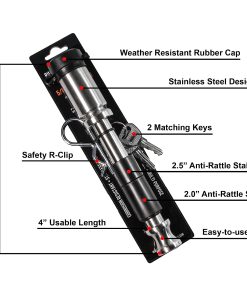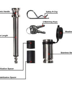 El pasador de bloqueo de 5/8″ de BulletProof es el pasador de bloqueo de mayor calidad en el mercado. Cuenta con un diseño completo de acero inoxidable que permite que el candado resista la corrosión y funcione año tras año. El mango ergonómico fácil de agarrar funciona bien incluso con guantes de invierno pesados. Incluye dos llaves y una tapa de goma resistente a la intemperie de alta resistencia que evita que la suciedad y la humedad entren en el mecanismo de bloqueo. Nuestro nuevo diseño también incluye un clip en forma de R y dos agujeros en el eje del pasador que se pueden utilizar para mantener el pasador en su lugar al usarlo en receptores más pequeños. Calificado para 36,000 libras con enganches de servicio extremo y una longitud universal diseñada a medida, hecha para ser utilizada con cualquier tamaño de receptor, incluyendo receptores de enganche de 2″, 2.5″ y 3″. También se puede usar para asegurar la bola doble u otros accesorios en el canal del enganche. Si se compran varios candados juntos, vendrán con la misma llave.
