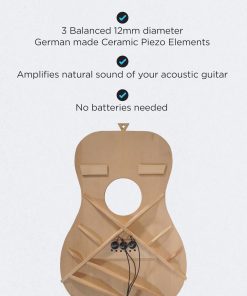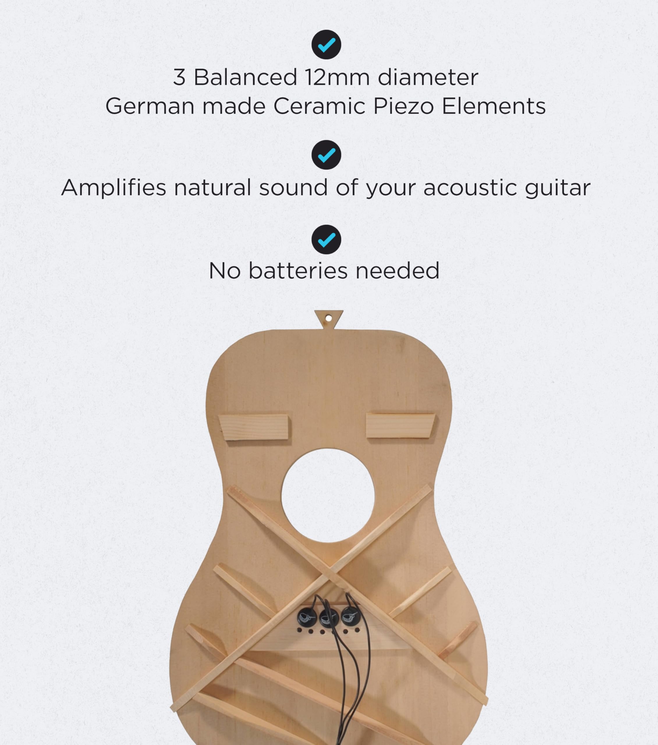 Una pastilla pasiva premium, actualizable, clara y transparente de 3 piezoeléctricos para guitarras acústicas. Utiliza elementos piezoeléctricos alemanes de alta salida y no requiere baterías.