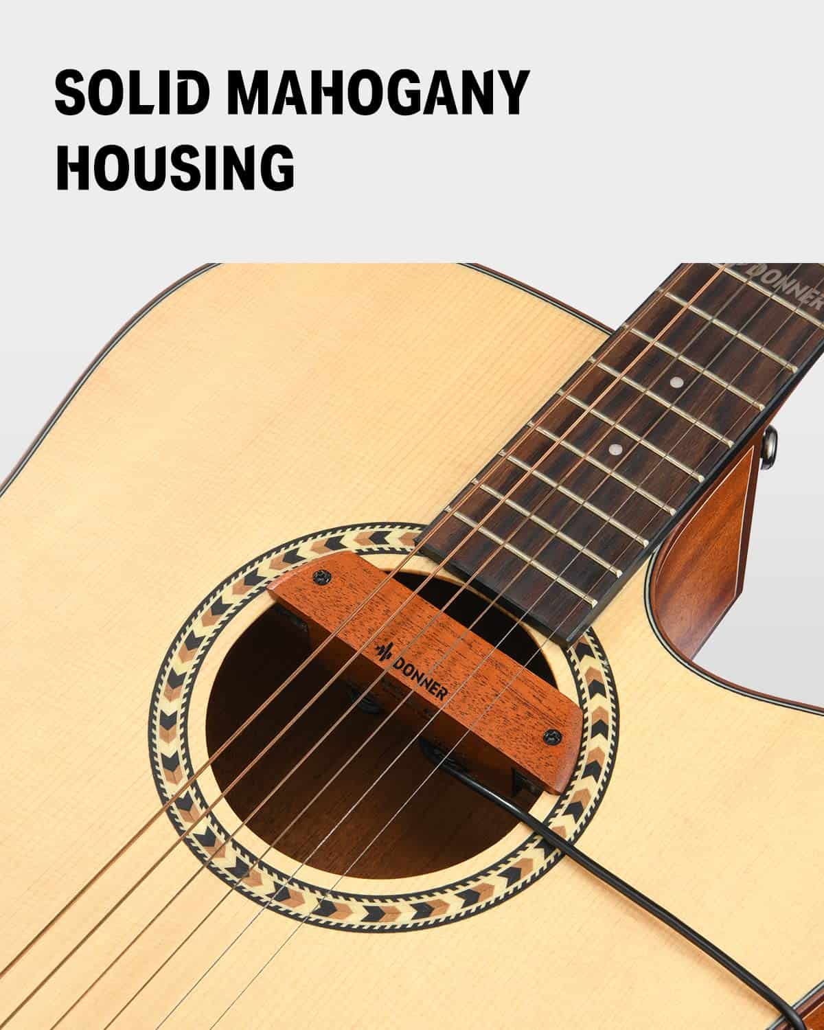 5. Carcasa de Caoba Sólida – La carcasa de caoba sólida puede transmitir las vibraciones acústicas de forma estable, proporcionando un tono equilibrado y claro. Además, la apariencia de caoba vintage con patrón natural combina con cada guitarra acústica.