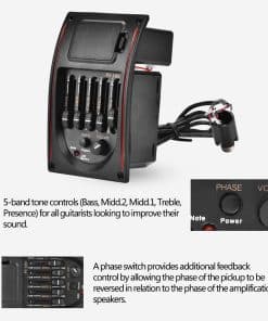 Con este preamplificador, pasarás menos tiempo ajustando controles y más tiempo tocando. En lugar de solo un interruptor, el ajustador de tonos cuenta con un control de contorno de volumen real para que puedas determinar con precisión el nivel del contorno y obtener el sonido correcto. Un interruptor de fase proporciona control adicional de retroalimentación al permitir que la fase de la pastilla se invierta con respecto a la fase de los altavoces de amplificación. Controles de tono de 5 bandas (Bajos, Medios.2, Medios.1, Agudos, Presencia) para todos los guitarristas que buscan mejorar su sonido. Gran accesorio para guitarras acústicas.
