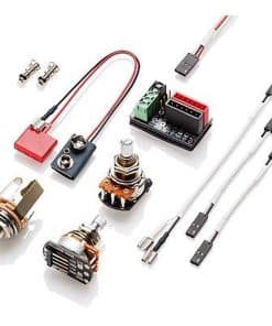 1. Cable de conexión rápida exclusivo de EMG. 2. Juego de control de volumen/tono con eje dividido ya precableado. 3. Jack de salida, juego de clip de batería, tornillos y resortes.