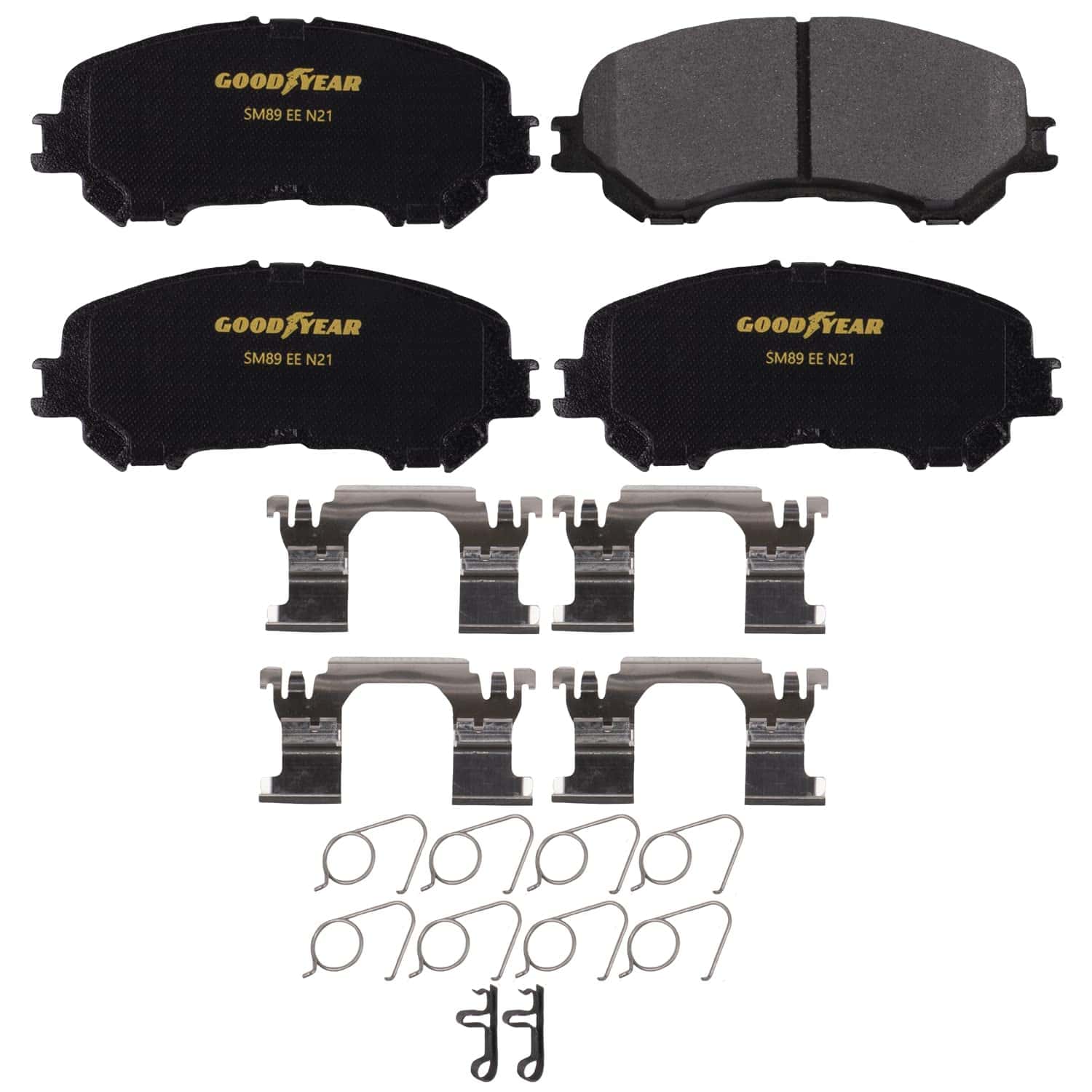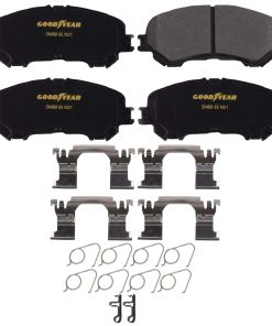 Las pastillas de freno Goodyear están formuladas específicamente para garantizar un frenado silencioso y con poco polvo, manteniendo al mismo tiempo máxima efectividad de frenado, control y durabilidad. Utilizamos una tecnología patentada de Banda de Trenza Vulcan para eliminar el ruido y proporcionar un viaje más cómodo – Se utilizan Ranuras y Biselados que cumplen con las especificaciones OE para reducir la vibración y la decoloración de los frenos. Goodyear Brakes siempre aplica un acabado en polvo de calidad en cada pastilla de freno para una protección máxima contra la intemperie y la corrosión. Se incluyen kits de herrajes premium cuando sea necesario. Las pastillas de freno Goodyear se fabrican con orgullo en EE. UU.