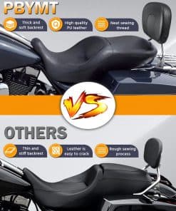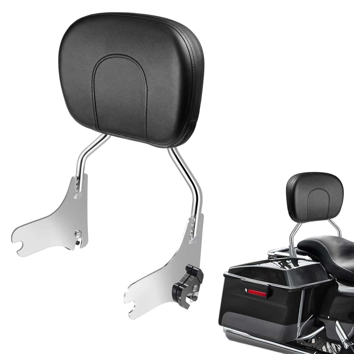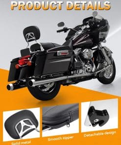 PBYMT Respaldo desmontable cromado para pasajero compatible con Harley Davidson Touring Street Glide Road Glide Electra Glide Road King del ’97 al ’08. Este kit de respaldo PBYMT está diseñado para adaptarse a los modelos Road King, FLHT, FLHX y FLTR equipados con los Kits de Acoplamiento necesarios. También se ajusta a los modelos FLHTC del ’06 al ’08 equipados con el Kit de Estante H-D Detachables Tour-Pak P/N 53303-07 y el Kit de Hardware de Acoplamiento P/N 53803-06. El respaldo está fabricado con acero de alta calidad para una durabilidad y vida útil prolongadas. El cojín del respaldo está recubierto con cuero suave y relleno de espuma para brindar un excelente soporte lumbar al pasajero y mejorar la comodidad de conducción en viajes largos. El diseño desmontable permite instalar o quitar el respaldo de la motocicleta en cuestión de segundos, de manera firme y sin sacudidas. El paquete incluye 1 x Kit de Respaldo Desmontable Sissy Bar (¡Instrucciones y kit de hardware de acoplamiento NO incluidos!). Por favor, consulta nuestra página de detalles para verificar la compatibilidad de tu motocicleta con este respaldo. Este respaldo no es adecuado para los modelos Ultra y Classic. Disfruta de un paseo cómodo y seguro con el respaldo desmontable PBYMT para tu Harley Davidson.