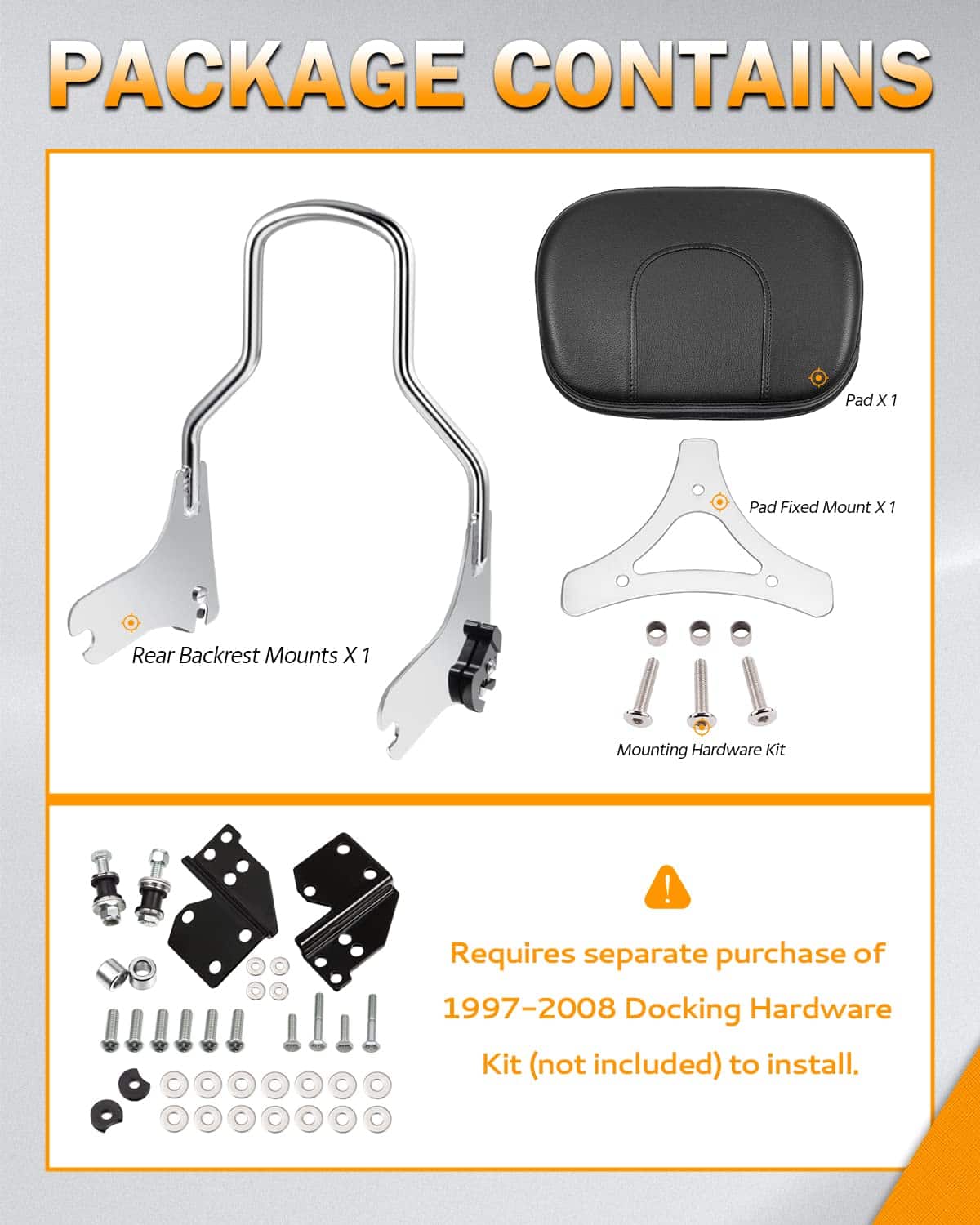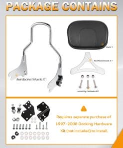 4. PAQUETE INCLUIDO – 1 x Kit de Respaldo Desmontable Sissy Bar. (¡Instrucciones y kit de hardware de acoplamiento NO incluidos!).