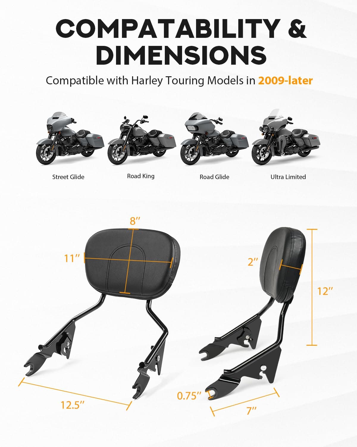 1. VERIFY MODEL & YEAR – El respaldo desmontable para pasajeros se ajusta a los MODELOS DE HARLEY DAVIDSON 2009-POSTERIORES (Street Glide/Road Glide/Road King/Electra Glide/Ultra Limited). Por favor, confirme el modelo y el año de su motocicleta antes de comprar.