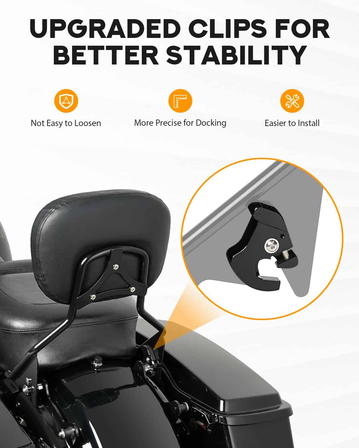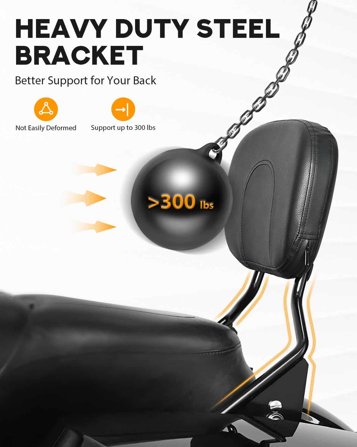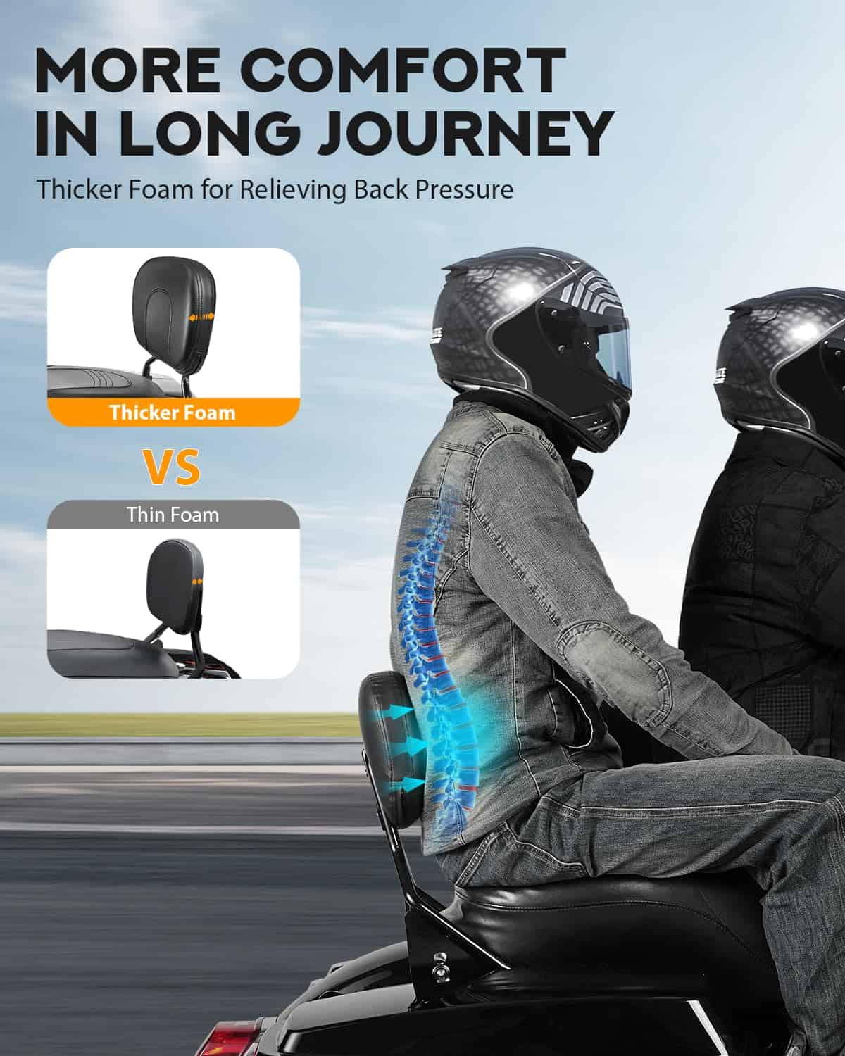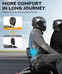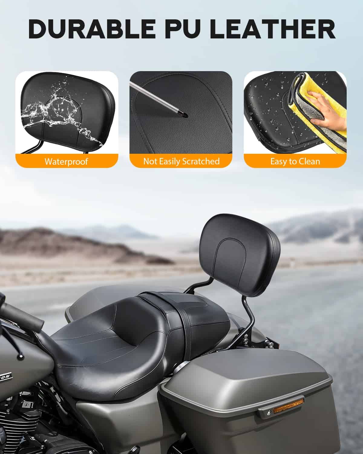 2. MÁS CÓMODOS VIAJES – La almohadilla de respaldo trasero compatible con Harley Davidson cuenta con cuero PU y espuma suave más gruesa, reduce la presión en la cintura con su diseño ergonómico. El sissy bar de liberación rápida compatible con Harley Davidson mejora la comodidad de la espalda en viajes de larga distancia.