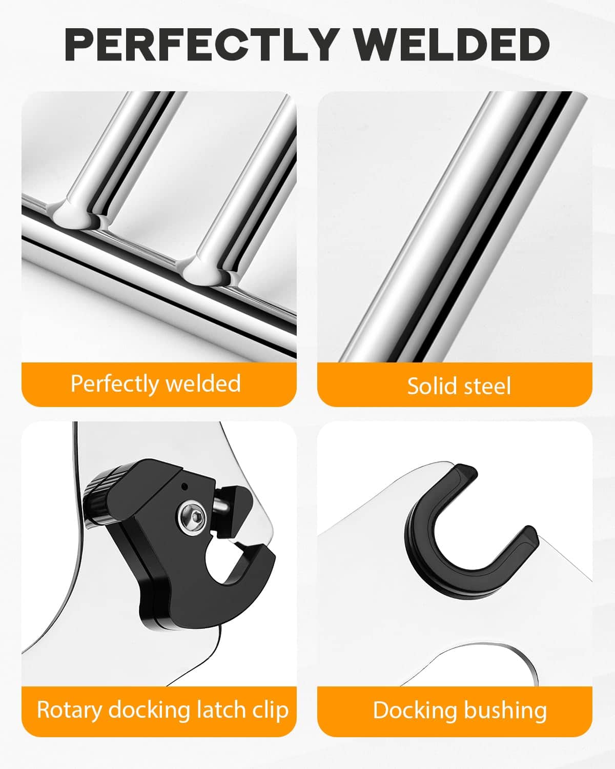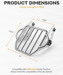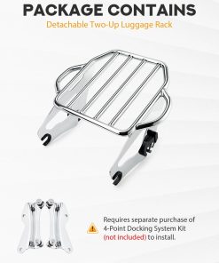 5. LO QUE RECIBES – 1x Soporte para equipaje cromado desmontable de dos plazas (como se muestra en la imagen), 1 par de clips y garantía de 6 meses. Ten en cuenta que el kit de hardware de anclaje y las instrucciones no están incluidos.