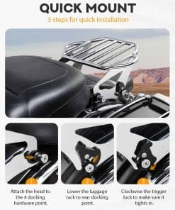 3. LIBERACIÓN RÁPIDA – Este soporte para equipaje desmontable de dos plazas se puede instalar o quitar fácilmente en segundos. Fácil de instalar y conveniente de usar. Proporciona a tu moto un diseño limpio. El ajuste perfecto sigue la fluidez y las líneas inclinadas desde la parte trasera de tu moto.