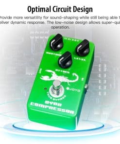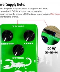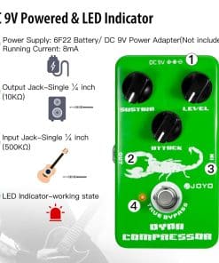 JOYO JF-10 Pedal de efecto compresor dinámico para guitarra cuenta con una re-creación del compresor clásico Ross, con muy poco ruido. Tiene tres perillas de ajuste, sustain, attack y level. El ajuste de ataque está diseñado para bajos o pastillas activas de alta salida para que se adapte mejor a los instrumentos. El diseño de Bypass Verdadero minimiza la pérdida de tono.
