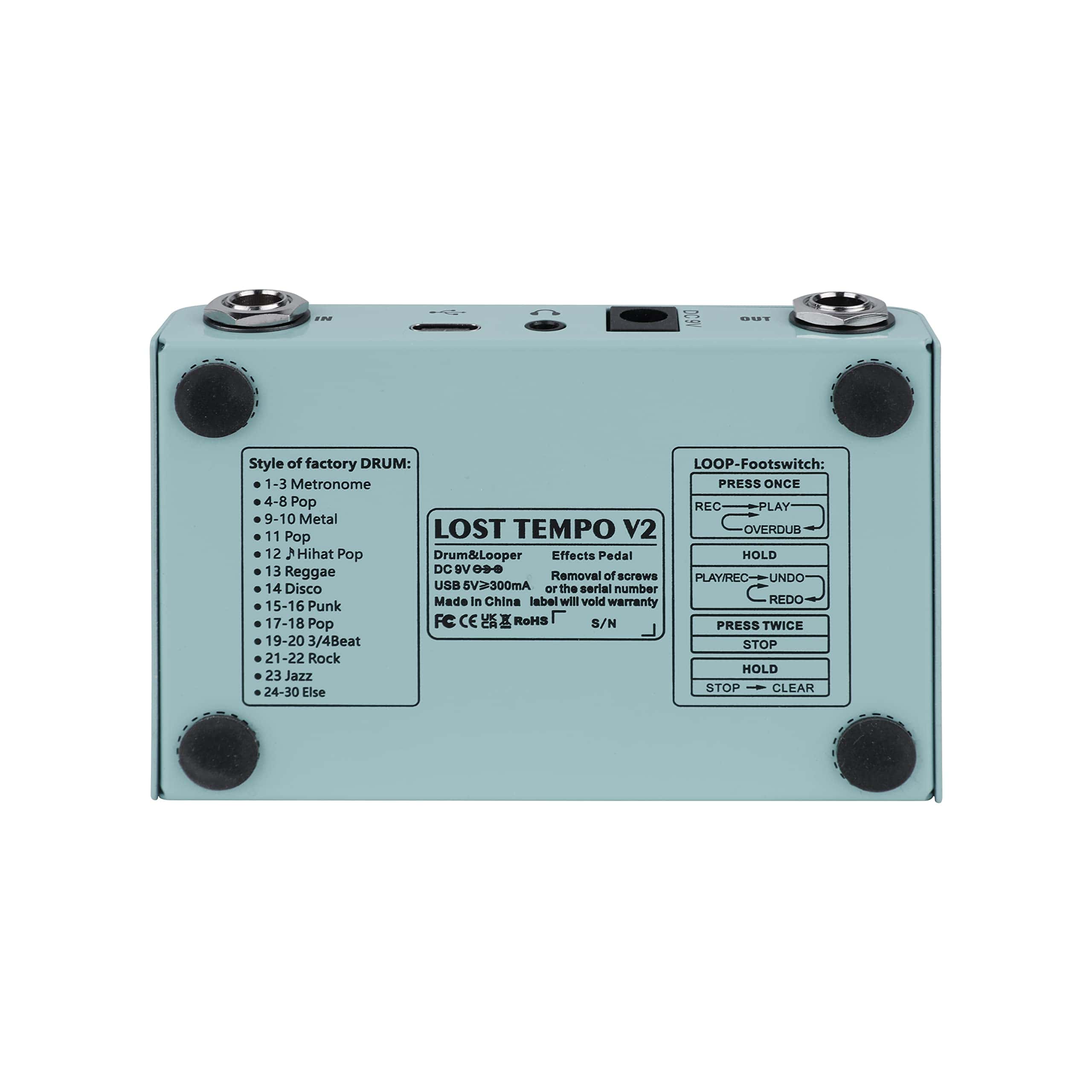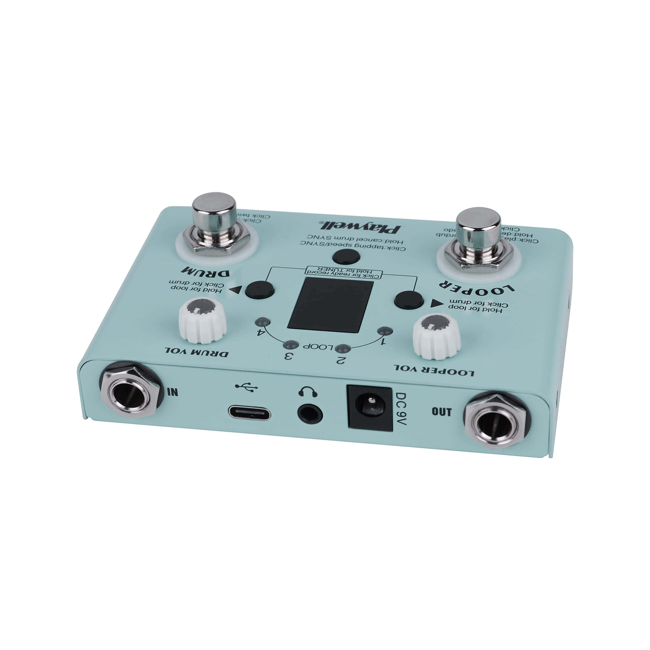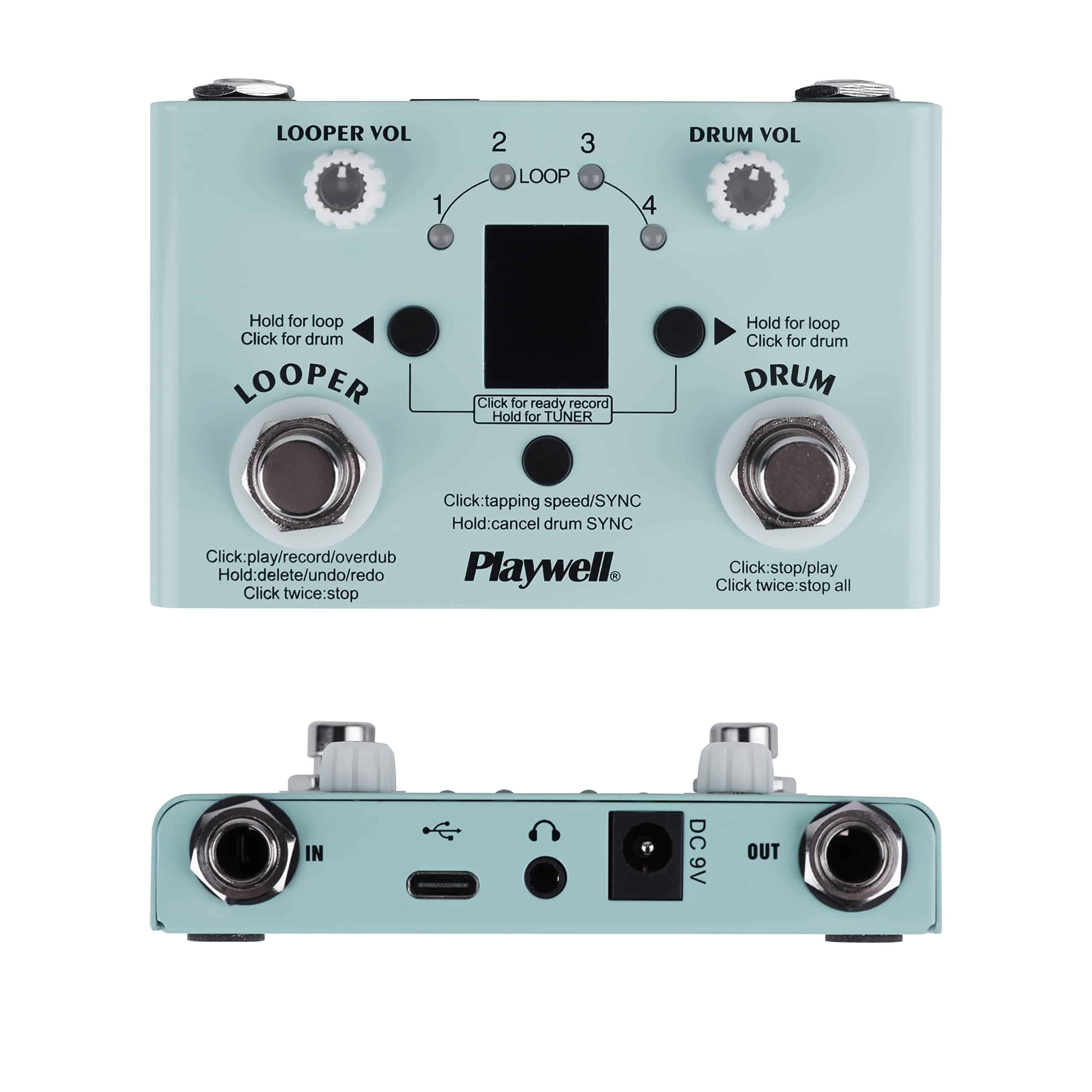 1. Cuatro modos: afinador, batería electrónica, loop, y modo mixto de batería electrónica y loop. 2. Incorpora 30 baterías preestablecidas, con soporte de app para personalizar, editar y guardar baterías. Los usuarios del mismo producto también pueden compartir códigos de batería entre ellos a través de la app. 3. Cuatro ubicaciones de almacenamiento de canciones de loop, con un tiempo total de grabación de no más de 11 minutos. El tiempo máximo de grabación de una sola ubicación de almacenamiento es de 5 minutos. Cada canción puede ser grabada con pistas superpuestas ilimitadas. 4. El indicador LED y la pantalla digital hacen que la grabación sea más intuitiva y conveniente. 5. La batería electrónica y el loop pueden ajustar el volumen por separado. 6. Modos de suministro de energía con DC 9V 300mA negativo en el interior y USB 5V 300mA. 7. Cuerpo de metal completo, resistente y duradero.