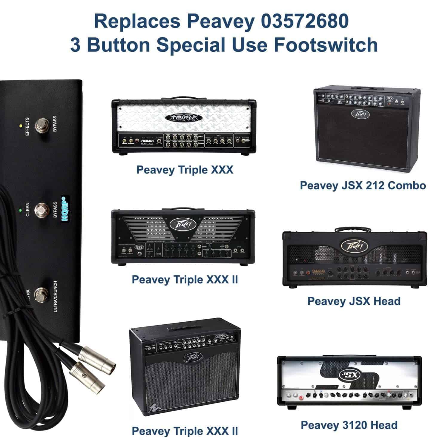 Pedal de cambio de tres canales HQRP con cable de 7 Pines Din. CALIDAD: El pedal de cambio HQRP está hecho de componentes de metal de calidad (botones, partes internas y enchufes). La carcasa moldeada garantiza un largo período de uso. ERGONÓMICO: El pedal tiene la parte superior inclinada que facilita la pulsación. La disposición conveniente de los botones asegura el cambio rápido y fácil de los efectos. AMIGABLE CON EL USUARIO: Los botones están ubicados a una distancia cómoda entre sí. 3 LEDs cerca de estos botones multiusos ayudan a rastrear si están activos o no. Reemplaza a Peavey OEM P/N: 03572680. Compatible con: Peavey JSX Head, Peavey JSX 212 Combo, Peavey 3120 Head, Peavey Triple XXX, Peavey Triple XXX 212 COMBOPeavey Triple XXX II