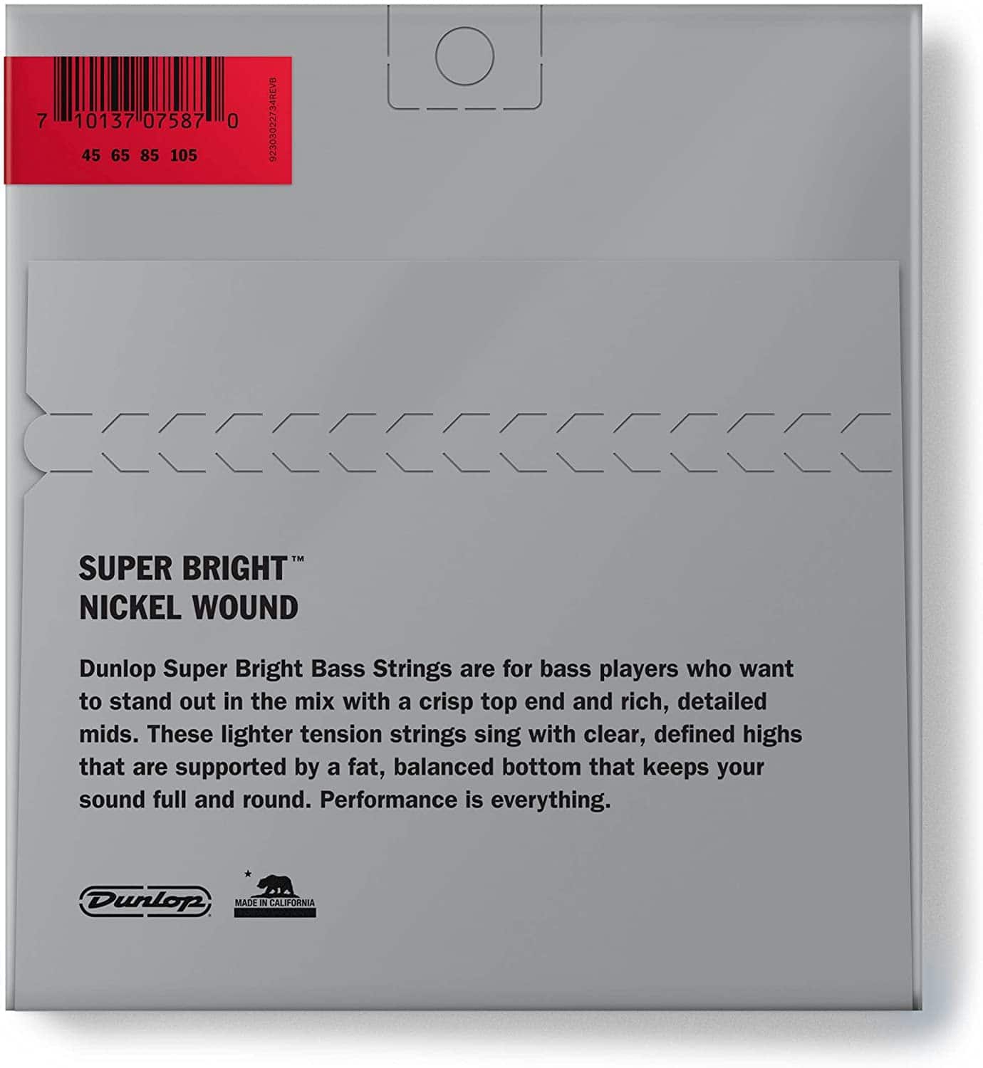 El Bass Chorus Deluxe de MXR está alimentado por tecnología de puente de cubeta puramente analógica, ofreciendo efectos de coro brillante y líquido y efectos de flanger swooshing y metálicos al tiempo que preserva la pegada y el fundamental de su rango de bajos. El Bass Chorus Deluxe cuenta con botones de Flanger y X-Over en la parte superior con indicadores LED de estado. En el Modo X-Over, la modulación en las frecuencias bajas se reduce a 100Hz, perfecto para tocar acordes, melodías y fills de registro superior mientras se mantiene el rango bajo afinado. Con los controles de Bajos y Agudos, puedes atenuar o realzar los graves y agudos y dar forma al carácter tonal del efecto. Para un sonido estéreo amplio, selecciona el Modo de Bypass Estéreo Hardwire TRS (tip-ring-sleeve) a través de un interruptor interno. En este modo, puedes usar un cable divisor Y TRS a TS (tip-sleeve) para enviar la señal de efecto a dos amplificadores diferentes, permitiendo que la modulación se mueva de izquierda a derecha. El Bass Chorus Deluxe se une a la lista de pedales galardonados en la línea de Innovaciones de Bajo de MXR, cada uno diseñado por bajistas para bajistas. CUERDAS DE BAJO NÍQUEL NICKEL WOUND DUNLOP SUPER BRIGHT 45-105 Calibres: 45, 65, 85, 105 Bajo – Níquel – Long Scale – Juego de 4 Cuerdas Estas cuerdas de bajo niqueladas te permiten destacar en la mezcla sin sacrificar tu fundamental, proporcionando un extremo superior dulce con medios contundentes y un extremo inferior gordo y equilibrado.