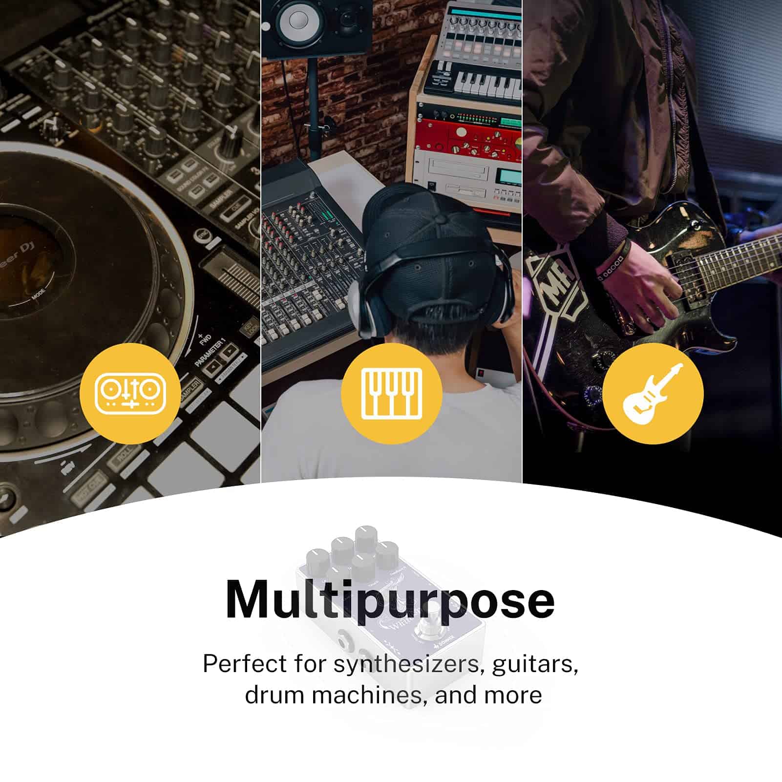 6. Ideal para Múltiples Instrumentos: No solo para guitarras, este pedal versátil se adapta a sintetizadores, máquinas de percusión y más, convirtiéndolo en una valiosa adición a la configuración de cualquier músico