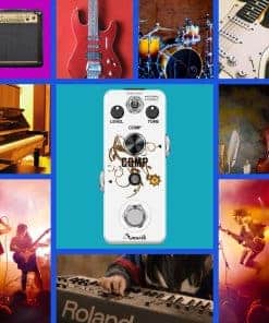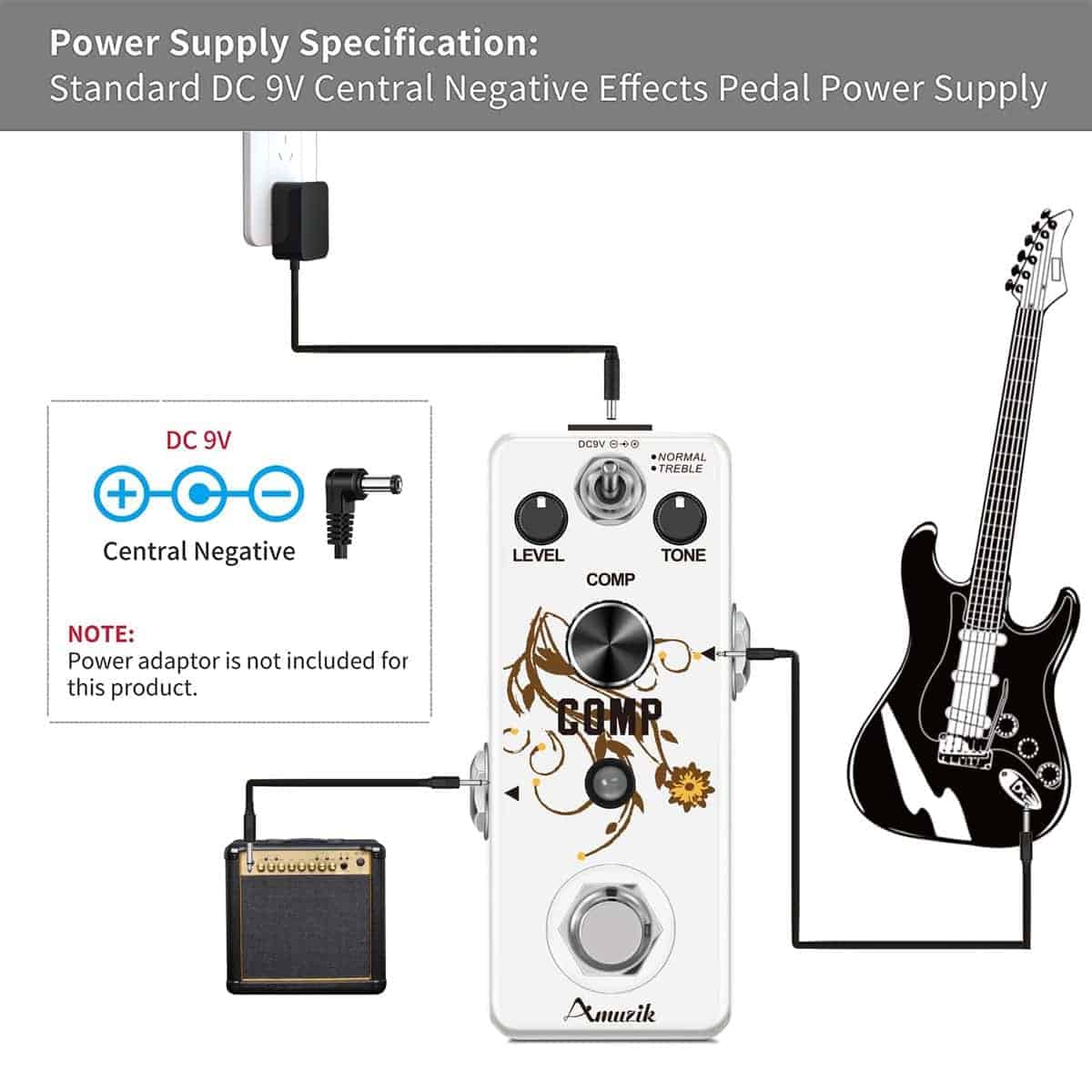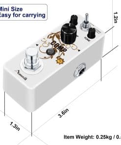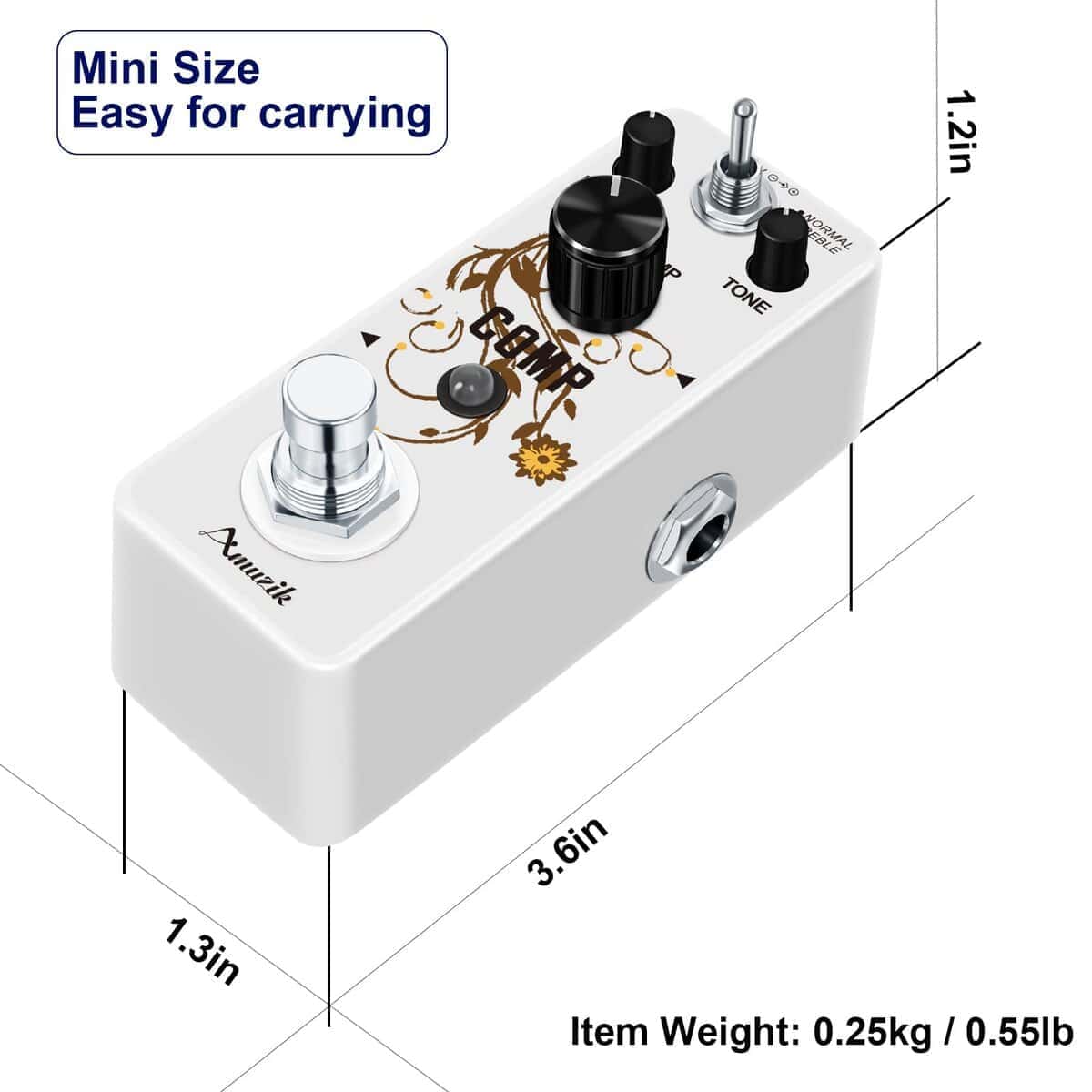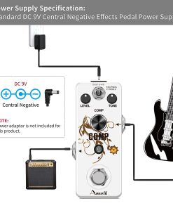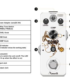 Sobre este pedal de efectos Comp Es un compresor óptico que proporciona un tono comprimido suave, maximizando el golpe de tus notas. Sentirás como si cada sonido de tu amplificador fuera masterizado en el estudio. Y hemos añadido un modo opcional a tu sonido. Características: 1. Dos Modos: Normal y Agudos. 2. Perilla de Nivel Controla el volumen del sonido con efecto. 3. Perilla de Tono Controla el tono del sonido. 4. Perilla de Comp Ajusta la intensidad de la compresión. 5. Luz LED Indicador LED muestra el estado de funcionamiento. 6. Caja de metal completo Aleación de zinc de alta calidad, estable y resistente. 7. True Bypass ByPass verdadero para cero coloración de tono. Especificaciones 1.Jack de Entrada y Salida Analógica a través de jack de audio mono de 1/4». 2.Fuente de Alimentación: DC 9V (la polaridad del enchufe es positiva en el barril y negativa en el centro). 3.Corriente de Funcionamiento: 12mA. 4.Dimensiones: 95(D) 45(W) 48(H)mm. 5.Peso: 273g (Con caja). Paquete incluido: 1 x Pedal de Efecto de Guitarra Comp de Amuzik 1 x Manual del Usuario 1 x caja de regalo