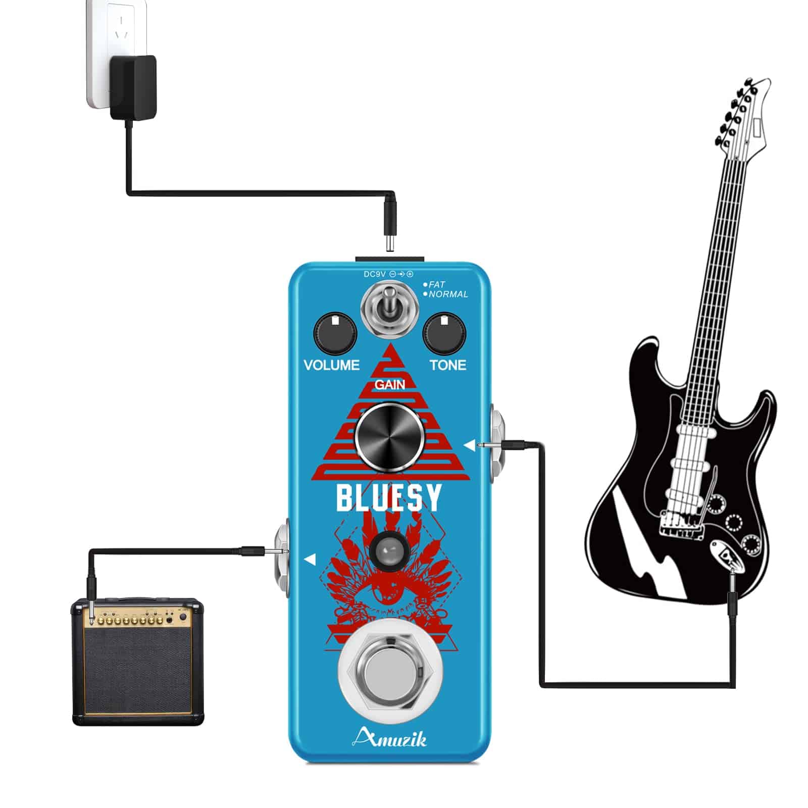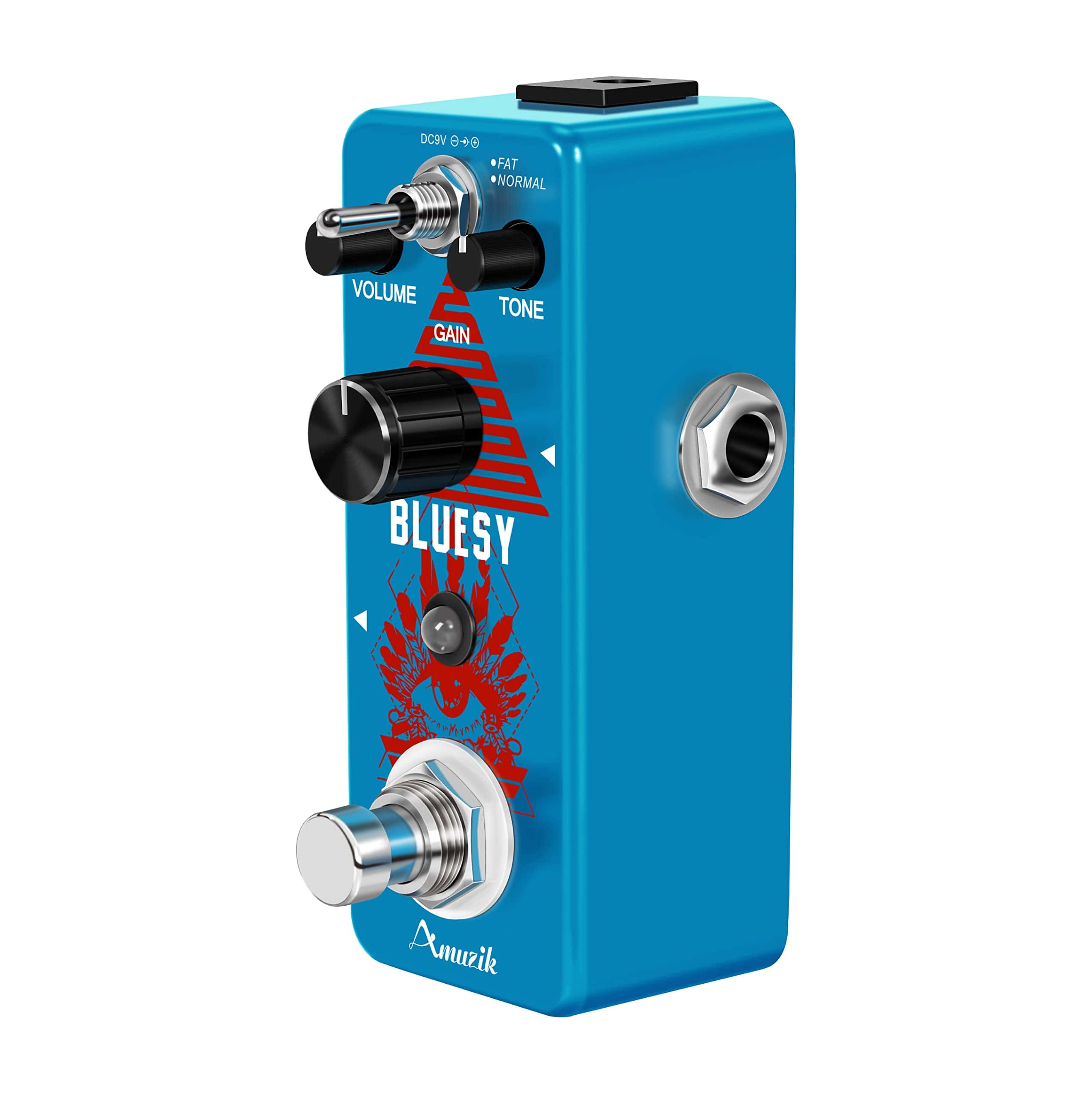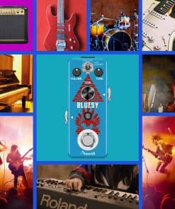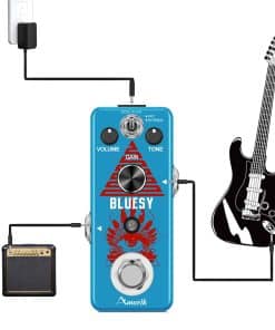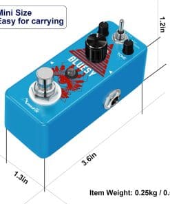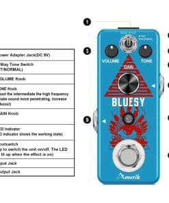 Marca: Amuzik Modelo: Distorsión Bluesy Color: Azul Material: Aleación de Zinc Entrada: Jack mono de 1/4 (impedancia: 1M Ohm) Salida: Jack mono de 1/4 (impedancia: 10k Ohm) Alimentación: Adaptador de corriente alterna 9V CC (Adaptador no incluido) Tamaño del artículo: 9.5 x 3.8 x 5.2 cm / 3.7 x 1.5 x 2 pulgadas Peso del artículo: 248g / 8.8oz Luz LED El indicador LED muestra el estado de funcionamiento. True Bypass Derivación verdadera para cero coloración tonal. Fabricado con aleación de zinc de alta calidad con construcción súper sólida. Paquete incluido: 1 x Pedal de Efecto de Distorsión Bluesy de Guitarra Amuzik 1 x Manual del Usuario 1 x Caja de Embalaje