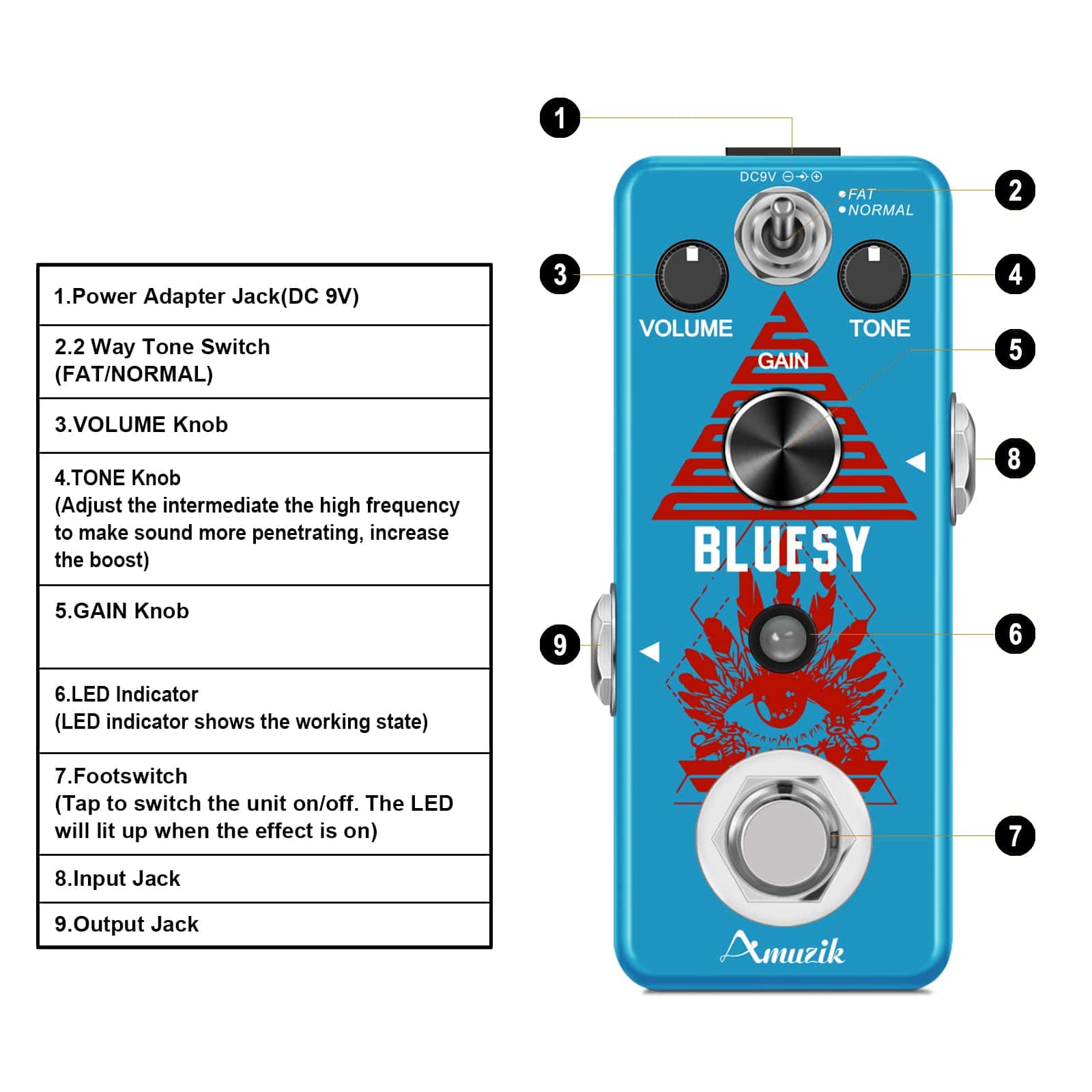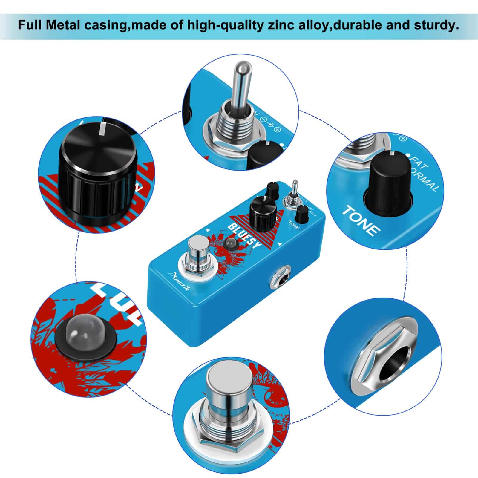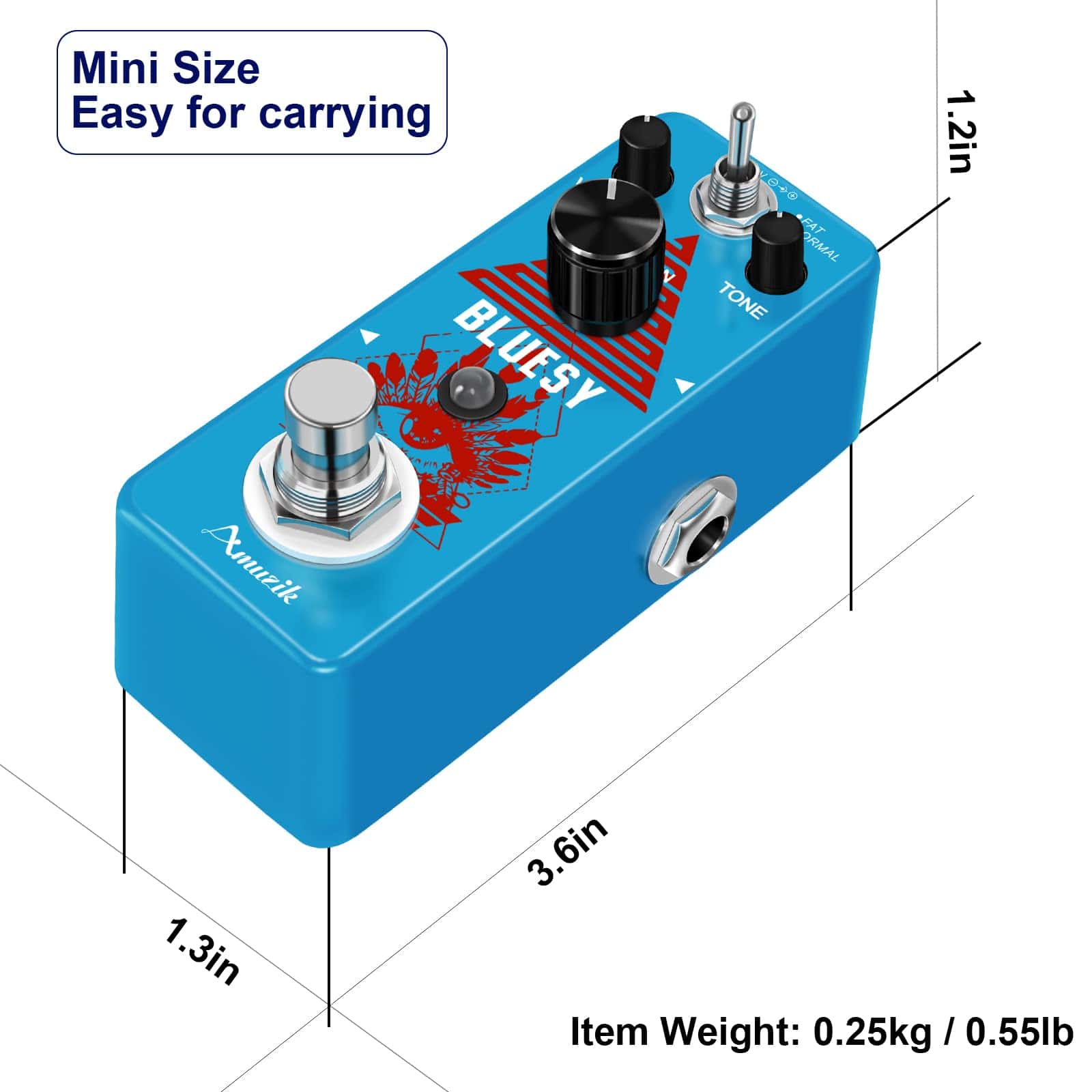 Marca: Amuzik Modelo: Distorsión Bluesy Color: Azul Material: Aleación de Zinc Entrada: Jack mono de 1/4 (impedancia: 1M Ohm) Salida: Jack mono de 1/4 (impedancia: 10k Ohm) Alimentación: Adaptador de corriente alterna 9V CC (Adaptador no incluido) Tamaño del artículo: 9.5 x 3.8 x 5.2 cm / 3.7 x 1.5 x 2 pulgadas Peso del artículo: 248g / 8.8oz Luz LED El indicador LED muestra el estado de funcionamiento. True Bypass Derivación verdadera para cero coloración tonal. Fabricado con aleación de zinc de alta calidad con construcción súper sólida. Paquete incluido: 1 x Pedal de Efecto de Distorsión Bluesy de Guitarra Amuzik 1 x Manual del Usuario 1 x Caja de Embalaje
