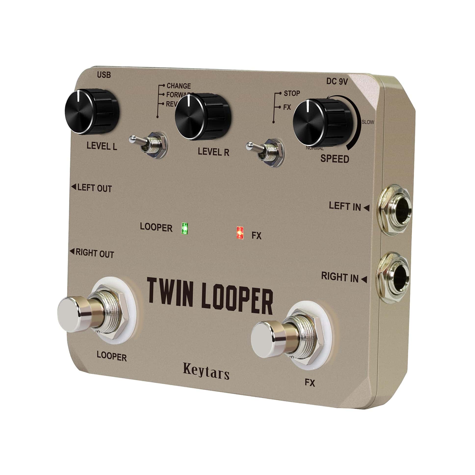 Keytars es un vendedor de fabricación profesional que vende pedales de efectos de guitarra, pedales looper y otras partes de instrumentos. Keytars se compromete a desarrollar productos de alta calidad y ayudar a todos los amantes de la música a crear su propio tono. Si recibe productos insatisfactorios, no dude en contactarnos para recibir soluciones. Twin looper es la combinación perfecta de calidad, creatividad y simplicidad, puede combinar su instrumento para hacer una actuación sutil o un espectáculo impresionante. Pedal de efecto Looper que te permite reproducir loops al revés, puedes alentar los loops o ralentizarlos rápidamente, a la mitad de la velocidad o ambas al mismo tiempo. 11 tipos de reproducción, entrada y salida estéreo, y volumen de canales izquierdo y derecho ajustables individualmente. Sonido HiFi/sin ruido. 10 minutos de tiempo de grabación en bucle, sobredosificación ilimitada y función de deshacer/rehacer. Tamaño pequeño, interruptor de pie resistente, bypass verdadero, carcasa de metal sólido resistente y bien construida. Especificaciones Entrada: Dos Jacks de 1/4 (Impedancia: 470k Ohms) Salida: Dos Jacks de 1/4 (Impedancia: 100 Ohms) Tasa de muestreo: 44.1K Precisión de muestreo: 24 bits 105 dB Rango dinámico Corriente de trabajo: 165 mA Fuente de alimentación: Adaptador de CA de 9V (punta positiva) Dimensiones: 116 mm (D)x90 mm (W)x35 mm (H) Peso: 522 g (con caja) Caja de aluminio entera clásica, estable y fuerte. Nota El adaptador de corriente no está incluido Precauciones Medio ambiente: No use el pedal en ambientes de alta temperatura, alta humedad o subcero. No use el pedal bajo la luz solar directa. Por favor, no desarme el pedal usted mismo. Guarde el manual para referencia futura. Paquete incluido 1 x Twin Looper Guitar Effect Pedal 1 x U