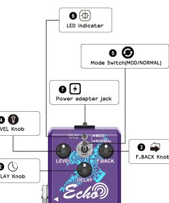 Detalle del Producto El pedal de efecto de retardo analógico más pequeño de la propia fábrica de VSN puede competir con productos similares caros. Para el retardo analógico, el tiempo de retardo de 20ms a 620ms es suficiente para satisfacer la demanda normal. Aunque el tamaño es pequeño y exquisito, está equipado con un botón de ajuste básico completo. Los tres botones de función son: LEVEL se utiliza para ajustar el volumen de retardo. F.BACK configura las notas repetidas. TIME establece el tiempo de retardo, dos modelos: MOD y NORMAL. Diseño de corriente pura de paso recto, señal constante. Propiedades del Producto Material: Aleación de aluminio Tiempo de retardo: 20ms 620ms Impedancia de entrada: 1 M Ohm Impedancia de salida: 490 Ohm Corriente de trabajo: 38 mA Fuente de alimentación: Adaptador 9V DC (negativo en el medio) Tamaño: 75mm (D) 36mm (W) 40mm (H) Peso: 210g (con caja) Nota: El color del artículo está sujeto al producto real, la imagen es solo de referencia, la tolerancia de medición es de +/- 1cm. Lista de Embalaje 1 Pedal de Retardo Mini 1 Manual del Usuario