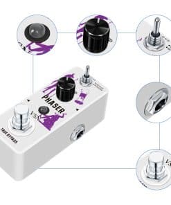 Características: Pedal de Efecto de Fase; Efecto de fase analógico puro, sonido cálido y lleno. 2 modos de trabajo: Vintage-perfecta reproducción del clásico efecto de cambio de fase psicodélico de 1974. Moderno-un efecto moderno y profundo a escala completa. Bypass verdadero que proporciona un tono transparente. El indicador LED muestra el estado de funcionamiento. Diseño pequeño y exquisito con carcasa de aleación de aluminio. Especificaciones: Entrada: Jack Mono de 1/4 de pulgada (Impedancia: 470K Ohmios). Salida: Jack Mono de 1/4 de pulgada (Impedancia: 10K Ohmios). Fuente de alimentación: DC 9V (la polaridad del enchufe es negativa en el centro). Corriente de trabajo: 6mA Dimensiones: 3.74×1.77×1.89 pulgadas. Peso: 8.47 oz (con caja). Lista de paquetes: 1 x pedal de efecto de fase de guitarra; 1 x manual de usuario.
