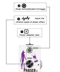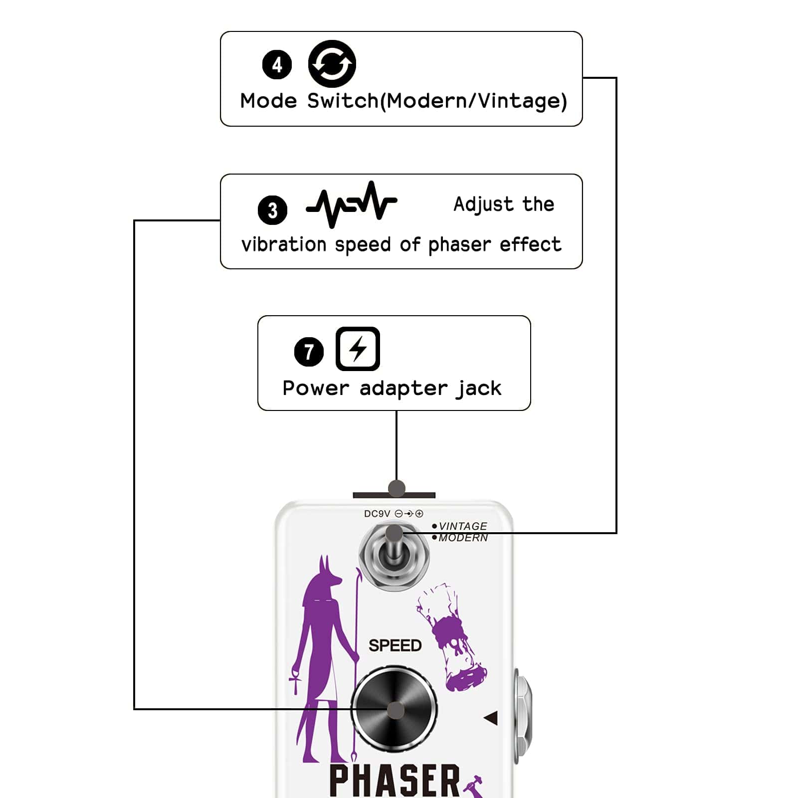 1. Phaser Pedal Efecto de fase analógico puro, sonido cálido y lleno. El indicador LED muestra el estado de funcionamiento. 2 Modos de trabajo: Vintage-perfecta reproducción del clásico efecto de cambio de fase psicodélico de 1974. Moderno-un efecto moderno y profundo a escala completa. 3. Corriente de trabajo 6mA; Fuente de alimentación: DC 9V (la polaridad del enchufe es negativa en el centro). 4. Dimensiones 3.74×1.77×1.89 pulgadas; Peso: 8.47 oz (con caja). Diseño pequeño y exquisito con carcasa de aleación de aluminio. 5. Nota: La alimentación del pedal de fase no está incluida, debes comprar una.