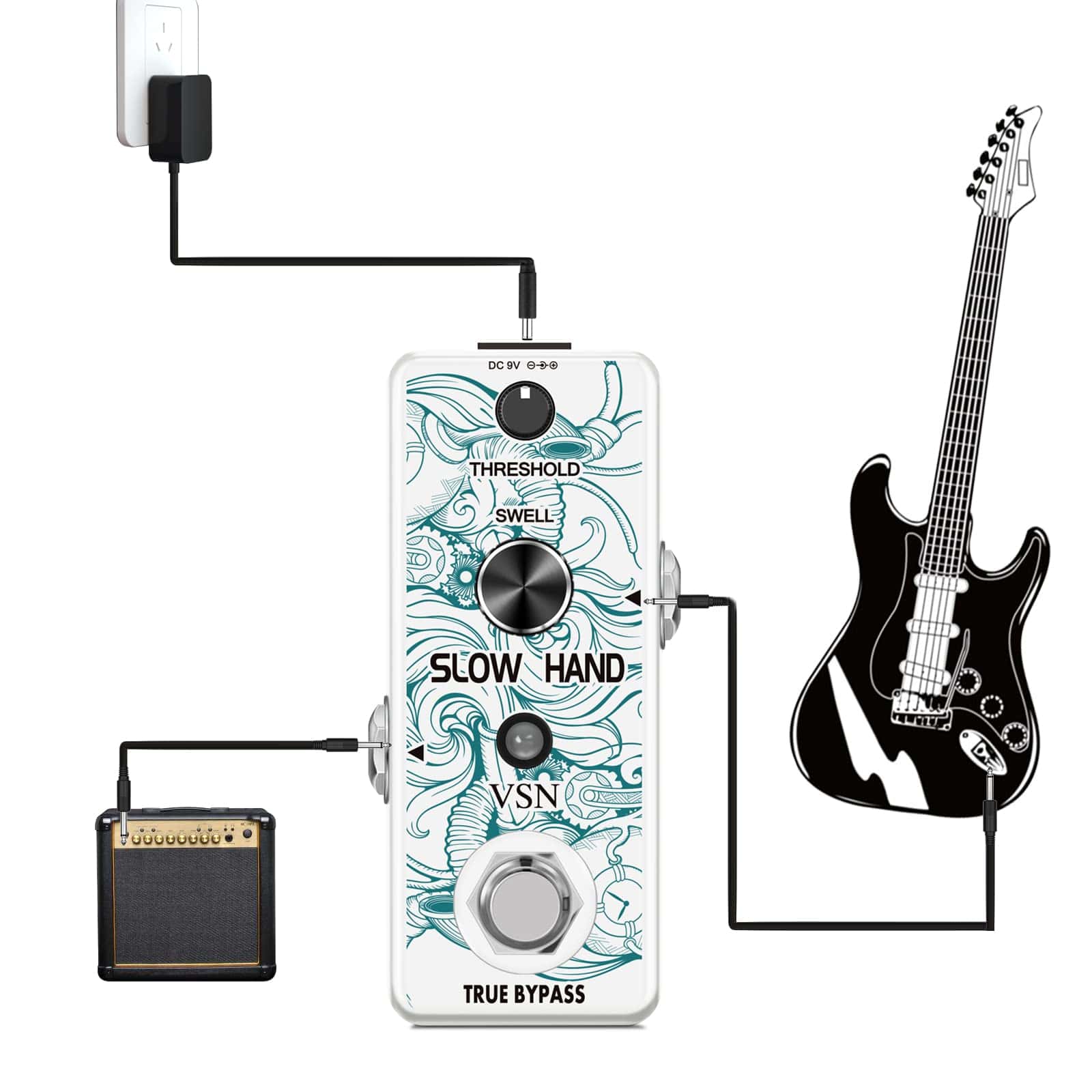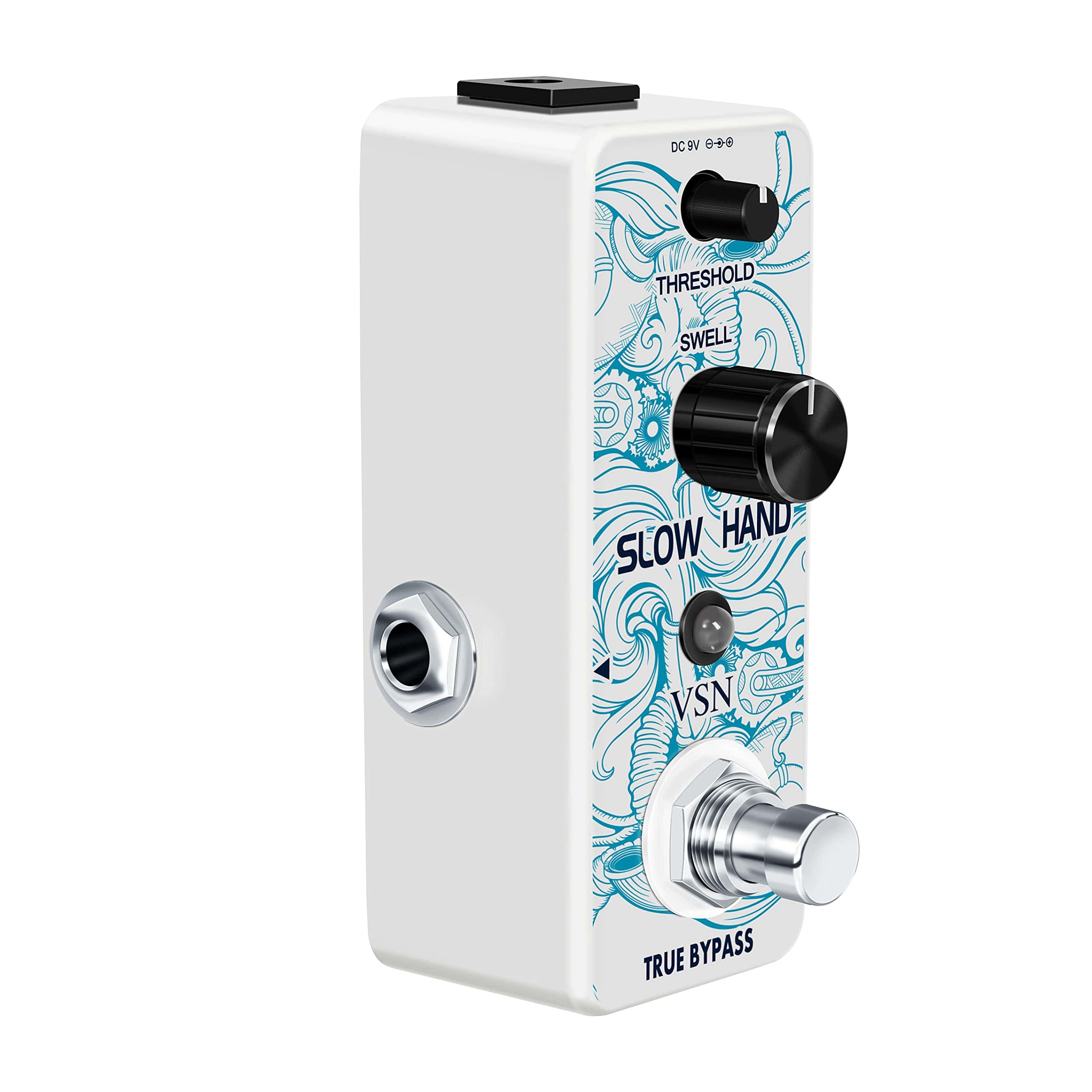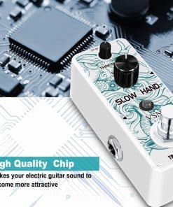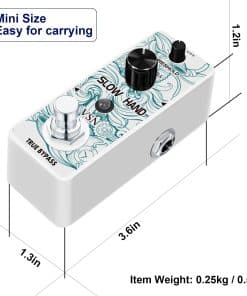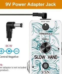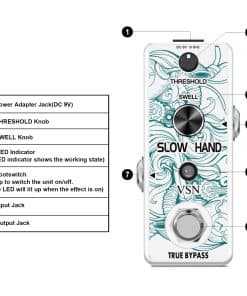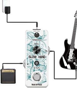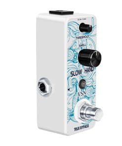 Pedal de Efecto de Guitarra VSN Slow Hand Slow Gear Un efecto único que casi parece ralentizar el sonido. El Slow Hand corta el ataque de cada nota y produce un efecto como subir el volumen en la perilla de la guitarra o el de un instrumento de cuerda frotada. Hinchazones como un engranaje lento. Usado con retardo, puede crear pasajes interesantes con sonidos retro. Características Los micro pedales de efecto VSN empaquetan un sonido INCREDIBLE en un paquete muy pequeño y están alojados en una carcasa de metal resistente para una durabilidad apta para la carretera. Pedal de enganche verdadero muy pequeño y exquisito con carcasa de metal completa. Especificaciones Entrada: Jack mono de 1/4″ (Impedancia: 470K Ohmios) Salida: Jack mono de 1/4″ (Impedancia: 100 Ohmios) Fuente de alimentación: DC 9V (La polaridad del enchufe es positiva en el barril y negativa en el centro) Corriente de trabajo: 100mA Dimensiones: 95(D) 45(W) 48(H)mm Peso: 273g (Con caja) Lista de paquetes: 1x pedal de engranaje lento VSN 1x Manual