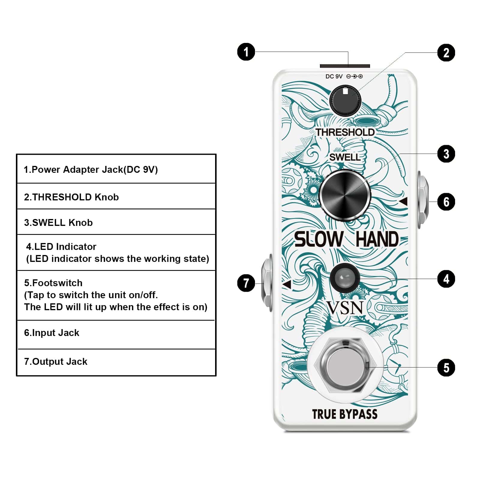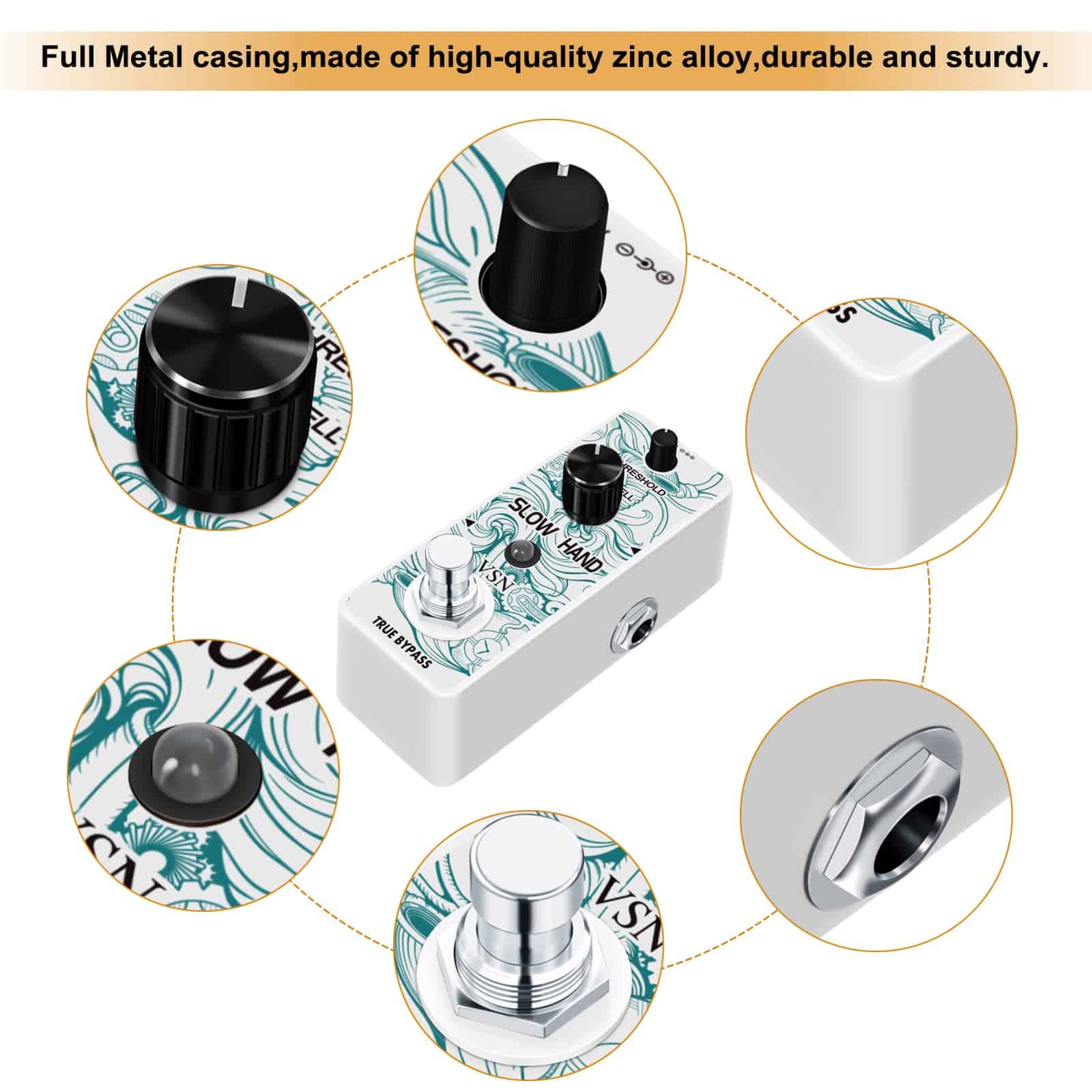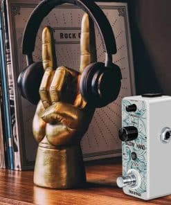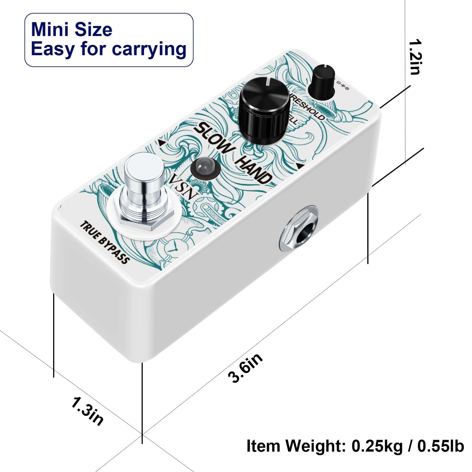 Pedal de Efecto de Guitarra VSN Slow Hand Slow Gear Un efecto único que casi parece ralentizar el sonido. El Slow Hand corta el ataque de cada nota y produce un efecto como subir el volumen en la perilla de la guitarra o el de un instrumento de cuerda frotada. Hinchazones como un engranaje lento. Usado con retardo, puede crear pasajes interesantes con sonidos retro. Características Los micro pedales de efecto VSN empaquetan un sonido INCREDIBLE en un paquete muy pequeño y están alojados en una carcasa de metal resistente para una durabilidad apta para la carretera. Pedal de enganche verdadero muy pequeño y exquisito con carcasa de metal completa. Especificaciones Entrada: Jack mono de 1/4″ (Impedancia: 470K Ohmios) Salida: Jack mono de 1/4″ (Impedancia: 100 Ohmios) Fuente de alimentación: DC 9V (La polaridad del enchufe es positiva en el barril y negativa en el centro) Corriente de trabajo: 100mA Dimensiones: 95(D) 45(W) 48(H)mm Peso: 273g (Con caja) Lista de paquetes: 1x pedal de engranaje lento VSN 1x Manual