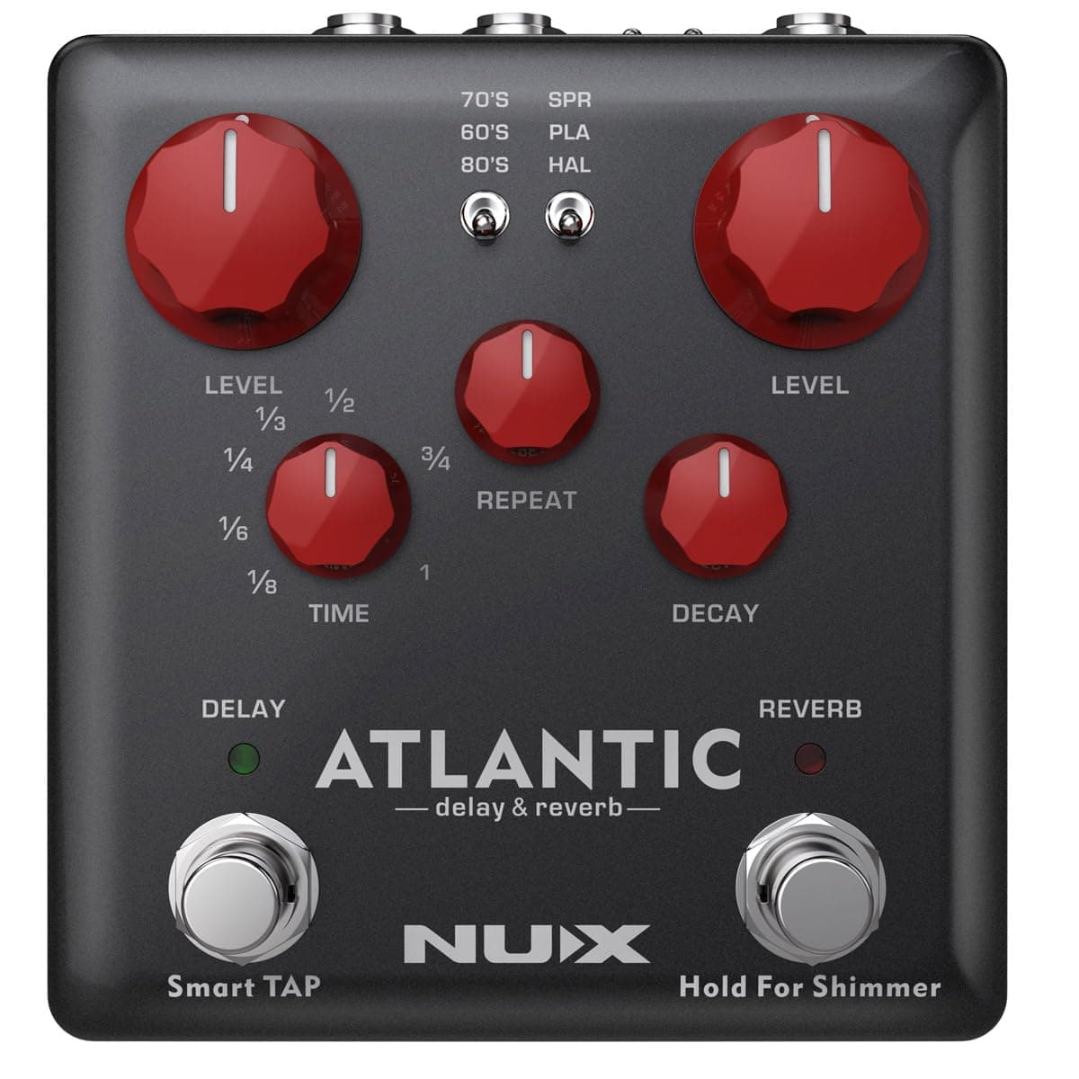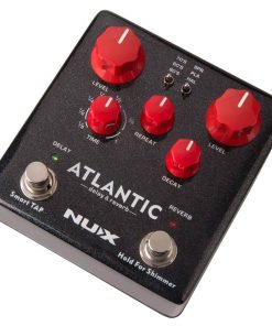Los efectos de Delay de NUX Atlantic br 70’s 40ms – 400ms: Retro-delay se encuentra con la tecnología moderna, sin perder las repeticiones realistas afectadas por BBD, tan esenciales para capturar la sensación retro de los años 70. br 60’s 55ms – 550ms: Un cálido / polvoriento efecto de máquina de cinta-eco, repleto de una variedad de cosas buenas solo analógicas. Colores saturados que convierten cualquier sonido en vintage. Ajusta al máximo la perilla Repeat y usa la perilla Time para obtener una experiencia, igual que la verdadera Máquina Tape-Echo. br 80’s 80ms – 800ms: Una invención de la era digital, repeticiones cristalinas. Repeticiones limpias copiadas digitalmente llevan tu señal sin absolutamente ninguna partícula de color. Esta es la mejor opción si no quieres mezclar tu coro favorito con otro efecto de colorización, o tu efecto de modulación favorito. br br Los efectos de Reverb de NUX Atlantic br El Atlantic tiene 3 tipos de efectos de reverb y cada tipo tiene un efecto secundario. Cuando cualquiera de los efectos de reverb está ENCENDIDO, mantén presionado el interruptor de pie de reverb para activar el efecto secundario. br br Enrutamiento Interno br El pedal de Delay y Reverb NUX Atlantic también tiene enrutamiento interno: control entre los efectos para elegir cuál efecto viene primero. En Modo Serial, puedes crear un reverb de reflexión profunda con repeticiones húmedas o secas, o puedes dividir la señal de tu guitarra y agregar ambos efectos en la cadena paralela. Cada efecto se mezclará con señales secas separadas. br br Entradas/Salidas br Tiene una entrada estéreo de 6.35 mm y 2 salidas para la máxima experiencia de delay y reverb. br Al enchufar un cable TRS en la entrada del pedal, puede agregar el Atlantic a cualquier cadena de efectos a través de la conexión Send/Return utilizando un cable Y o un cable Insert. br br Características Principales: br 3 Delays típicos con Smart Tap Tempo y subdivisión br 3 excelentes Reverbs con función secundaria al mantener presionado el interruptor de pie br Opciones de enrutamiento versátiles br br Lista de paquetes: br 1 NUX Atlantic