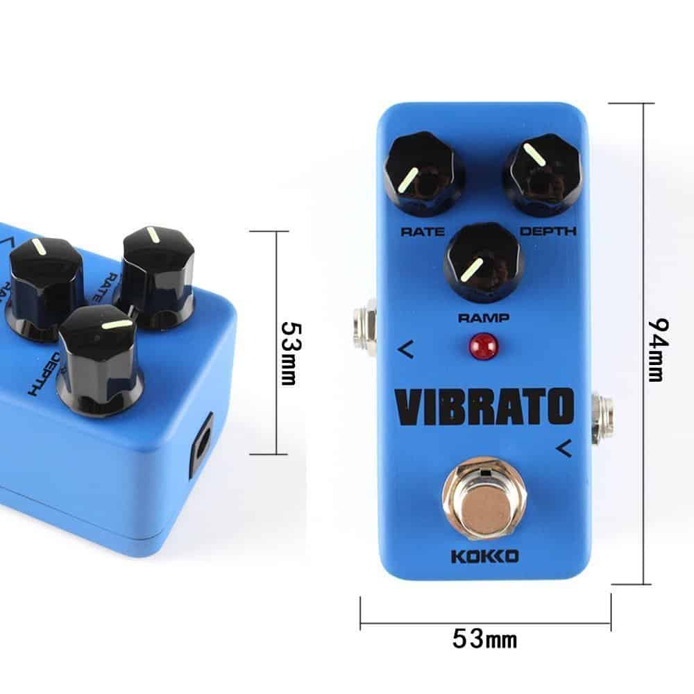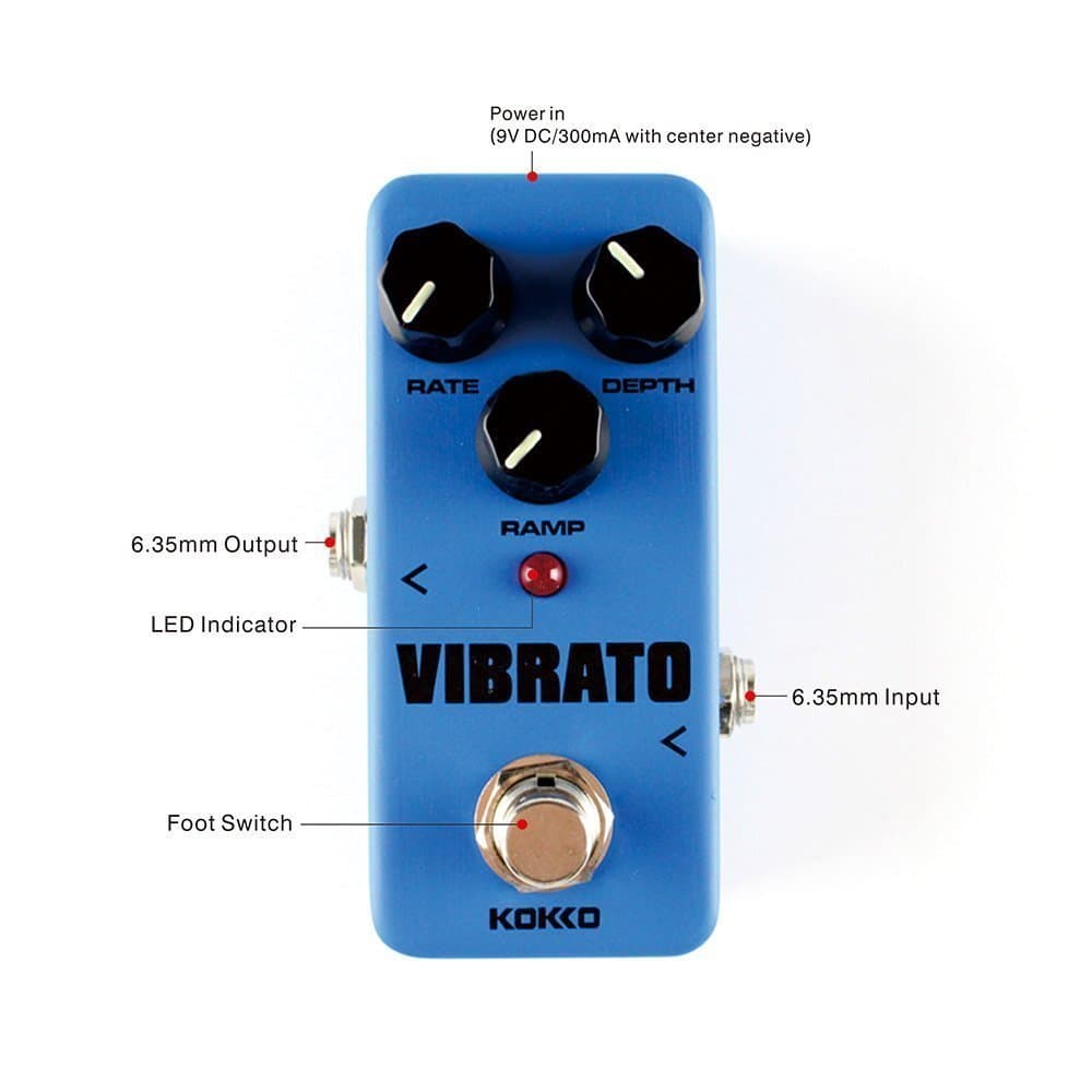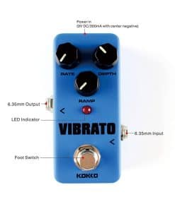 Especificaciones: – Marca: KOKKO – Modelo: FVB2 Vibrato (Mini) – Material Principal: Aleación de Aluminio – Impedancia de Entrada: 1M Ohms – Impedancia de Salida: 10K Ohms – Fuente de Alimentación: Adaptador de CA externo que suministra 9V CC regulados mínimo 300mA – Tamaño del Artículo: 9.4cm x 5.1cm x 5.3cm – Peso del Artículo: 180g – Tamaño del Paquete: 11cm x 7.1cm x 6.7cm – Peso del Paquete: 214g / 7.5oz Lista de Paquetes: – 1 Pedal de Efecto para Guitarra – 1 Manual de Usuario (Inglés) Nota: – Por favor, no use el pedal en ambientes de alta temperatura, alta humedad o bajo cero – Por favor, no use el pedal en la luz solar directa – Por favor, no desarme el pedal usted mismo – Por favor, guarde el manual para futuras consultas