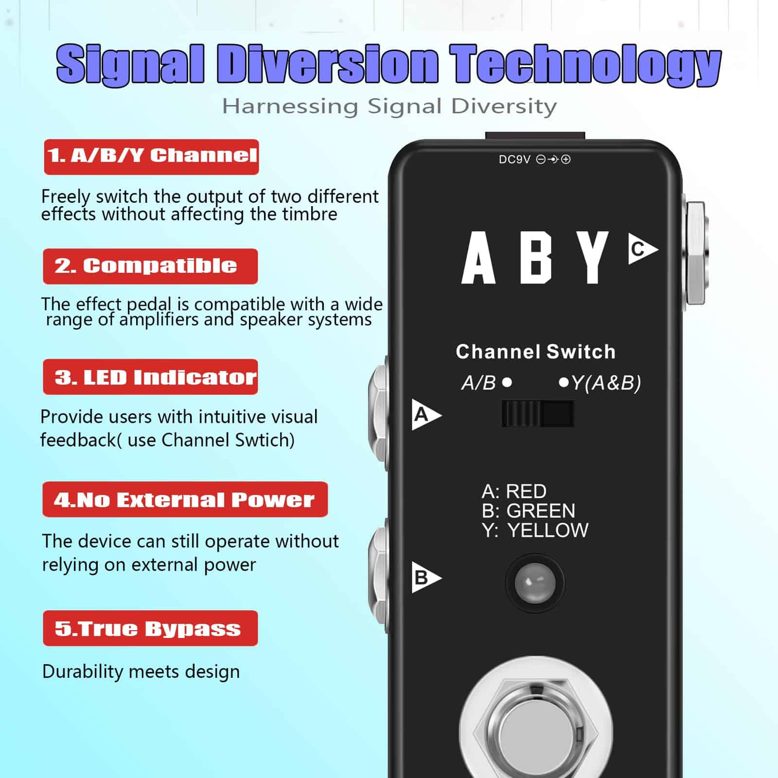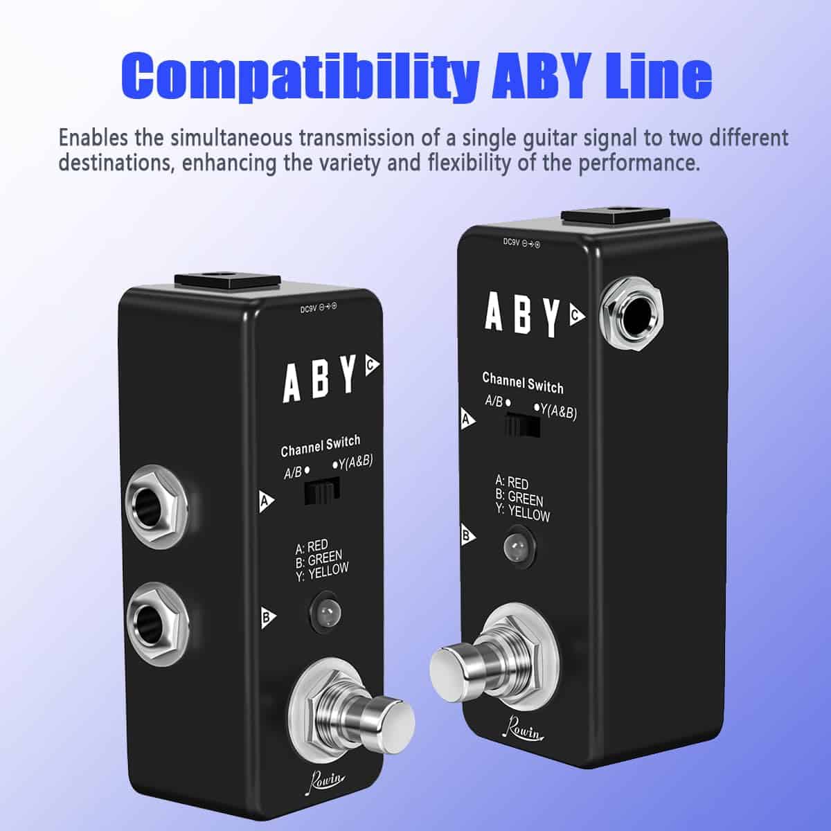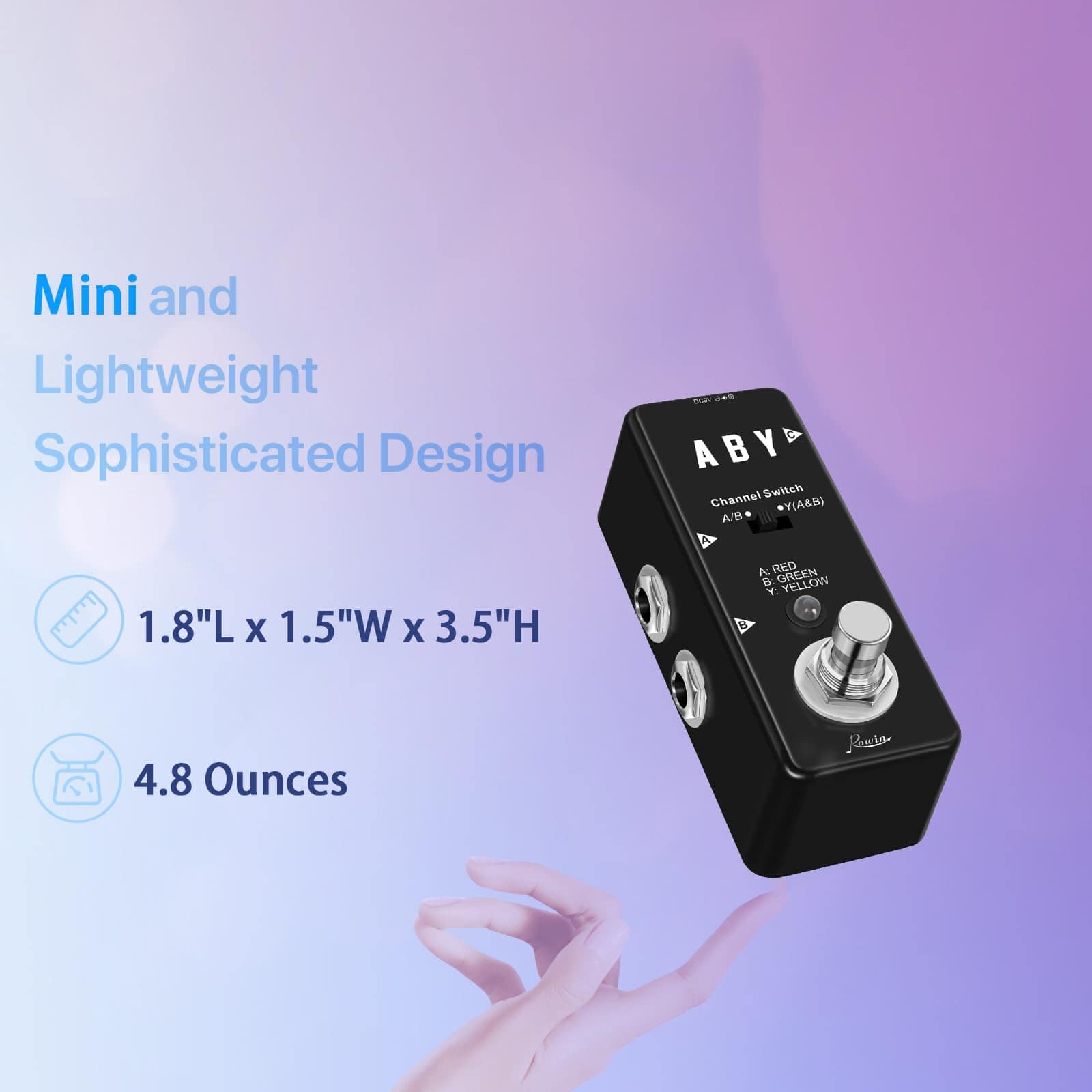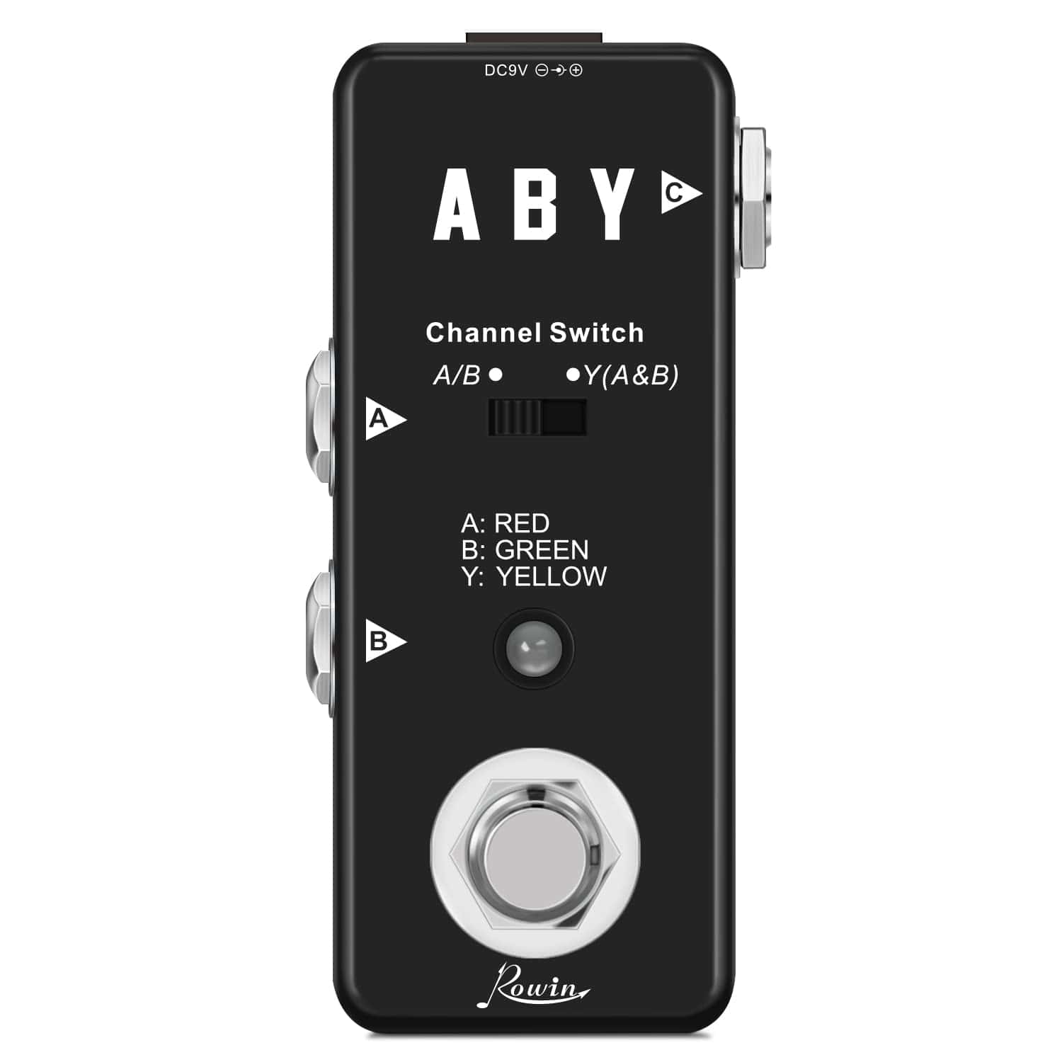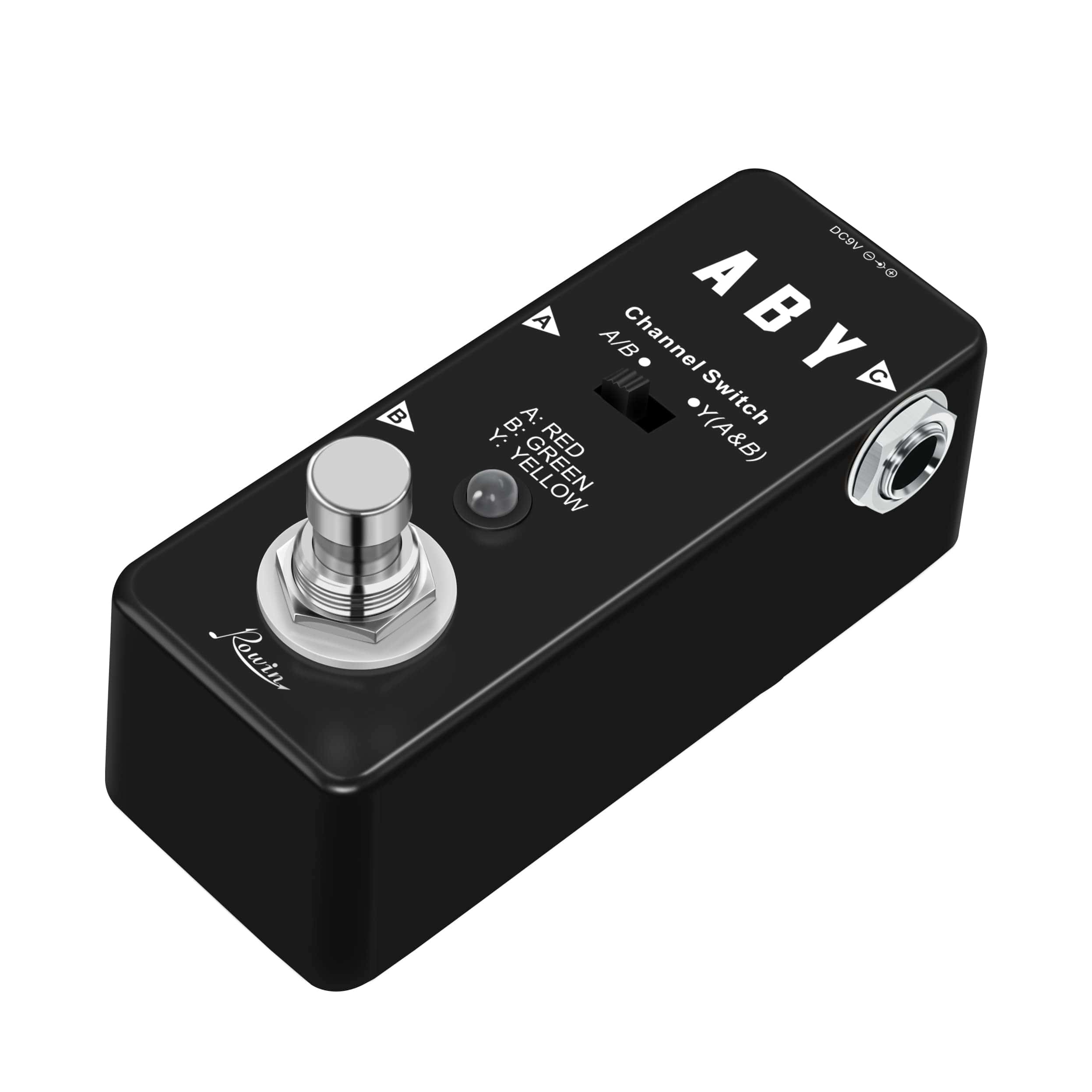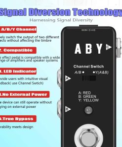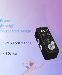 LEE ANTES DE COMPRAR Por favor, ten en cuenta: El pedal solo se utiliza en modo «A o B». Para dividir tu señal en modo A + B, debes usar el pequeño interruptor deslizante que no puedes activar con el pie. Acerca del Pedal Rowin ABY Amplía la versatilidad de tu equipo, cambia entre amplificadores o combina dos señales con este pedal ABY. Con su huella notablemente más pequeña y la completa funcionalidad de una solución ABY de tamaño completo, la caja ABY pasiva de Rowin ofrece flexibilidad de rendimiento completa en la situación de presentación. Para ayudarte a hacer pasar tu instrumento a través de dos amplificadores simultáneamente o cambiar entre ellos fácil y rápidamente. Características: Carcasa metálica completa, duradera y exquisita. LED A/B: Indica el canal A o B del ABY de micro. El canal A corresponde al LED rojo. El canal B corresponde al LED verde. Ambos A y B corresponden al LED amarillo. Jack A: Jack de audio mono de 1/4″ para conectar instrumentos. Jack B: Jack de audio mono de 1/4″ para conectar instrumentos. Jack Y: Jack de audio mono de 1/4″ para conectar instrumentos. Presiona el interruptor de pie para cambiar entre el canal A y B. Especificaciones: Efecto: Selector de Línea Material: Aleación de Aluminio Alimentación: Adaptador de corriente alterna 9V DC (no incluido) Tamaño del artículo: 9 3.8 4.8 cm / 3.5 1.5 1.8 pulgadas Peso del artículo: 137g / 4.8oz Tamaño del paquete: 12 7 6.5 cm / 4.7 2.7 2.5 pulgadas Peso del paquete: 230g / 8.1oz Lista del paquete: 1 Pedal de Guitarra ABY Line 1 Manual del Usuario (Inglés y Chino)