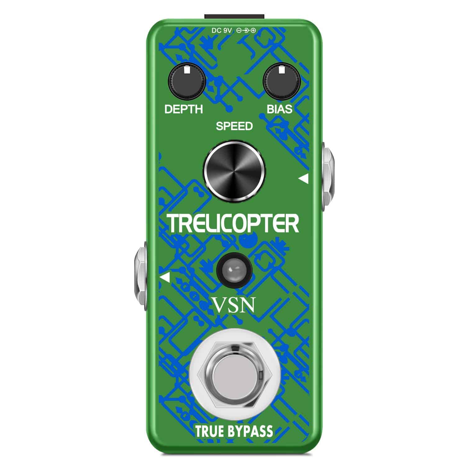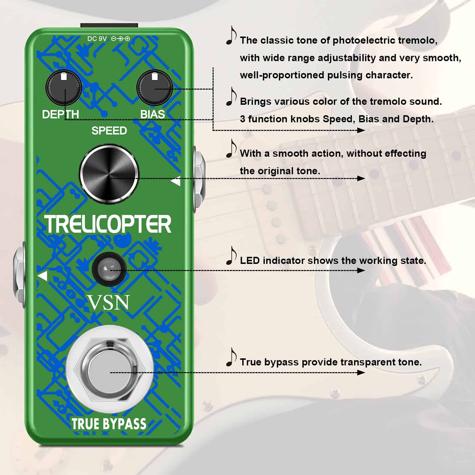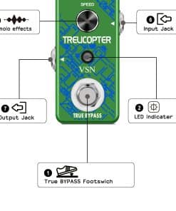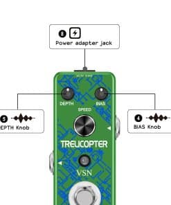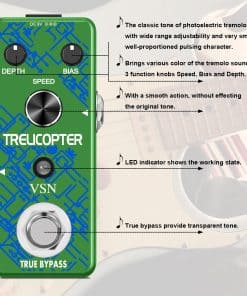Pedal de tremolo con circuito analógico: El pedal de efectos de tremolo VSN Trelicopter ofrece efectos de tremolo clásicos con una amplia gama de velocidades y profundidades. Incluso puedes ajustar el color del sonido con la perilla de SESGO. Su carcasa de metal completo lo hace duradero y resistente, y al igual que la mayoría de los excelentes pedales de efectos, tiene un bypass verdadero. Como vendedor del fabricante, hemos reforzado la calidad de producción de PCB y SOP y ofrecemos pedales de alta calidad a un precio imbatible. Características: Alimentación 9V DC (negativo en el centro). Perilla de profundidad para controlar la profundidad del efecto tremolo. Perilla de SESGO para ajustar el sesgo de la unidad de tremolo óptica. Perilla de velocidad para ajustar la velocidad del efecto tremolo. Conectores de entrada y salida analógicos a través de jack de audio mono de 1/4. Luz LED que muestra el estado de funcionamiento. Bypass verdadero para ninguna coloración del tono. Hecho de aleación de zinc de alta calidad con una construcción súper sólida. Especificaciones: Corriente de funcionamiento: 26mA. Dimensiones: 95(D) 45(W) 48(H)mm. Peso: 273g (Con caja). Paquete incluido: 1 x Pedal de Efecto Tremolo VSN Guitar, 1 x Manual del usuario. Notas: Por favor, ten en cuenta que este pedal NO puede ser alimentado por baterías. Necesita una fuente de alimentación de 9V DC con negativo en el centro para funcionar. Por favor, cómpralo por separado en la tienda VSN Music. ¡Gracias!