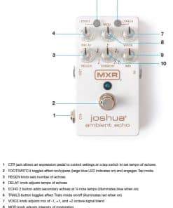 El MXR Joshua Ambient Echo es un todo en uno sumergido en paisajes sonoros icónicos, desde viajes tonales de los años 60 y 70 hasta la ambrosía etérea de los años 80. Anteriormente, necesitabas un procesador de rack completo para obtener estos tonos, pero este pedal viene con todo lo necesario para copiar esa paleta tonal distintiva en un formato moderno y fácil de usar, ya está ajustado y listo para funcionar. Construido sobre una base de tonos y texturas meticulosamente afinados que se combinan para encapsular la rica esencia atmosférica y el gran sentido del espacio que han sido el sello distintivo de innumerables pistas clásicas. Todo está incorporado, solo tienes que sazonar al gusto y trascender la estratosfera sónica. La base del MXR Joshua Ambient Echo es su configuración de delay altamente personalizable, ofreciendo control no solo sobre el tempo y el número de ecos con controles Delay y Regen, sino también sobre su ritmo. Con un giro del control de División, puedes seleccionar desde nota, nota punteada, nota, nota puntiaguda, tríada de nota, doble delay con nota y nota puntiaguda. ¿Quieres que tus ecos sigan reverberando incluso después de desactivar el pedal? Simplemente activa Trails. ¿Quieres un sonido aún más dinámico? El interruptor Echo 2 agrega un conjunto secundario de ecos establecido a un tempo de 1/4 de nota que puede ajustarse a través de configuraciones avanzadas. Con el MXR Joshua Ambient Echo, refinar los tonos y texturas de tus ecos es intuitivo y fácil. El control Mod lava tu señal de delay con una modulación exuberante y masticable. Una vez que esté ajustado, eleva todo el paisaje sonoro a alturas celestiales con el control Voice. Conjura una aura angélica y de órgano a través de una mezcla personalizada de -1 sub-octava, +1 octava arriba y +2 octava arriba, amplificando la ambrosía etérea ya creada por los otros elementos del pedal para una experiencia sónica verdaderamente sobrenatural. El MXR Joshua Ambient Echo está cuidadosamente afinado para lograr un brillo atmosférico directamente desde la caja sin necesidad de muchos ajustes de tu parte, pero si sientes ese llamado de sirena para una mayor exploración sónica, entonces este pedal tiene todas las herramientas que necesitas para dar forma a paisajes sonoros complejos y personalizados. Junto con la capacidad estéreo y de pedal de expresión, puedes ajustar hasta 12 parámetros diferentes, desde cómo parpadean los LED hasta la mezcla de la señal de eco secundaria. Incluye el paquete Tonebird que viene con fuente de alimentación Dunlop ECB003 de 9v, herramienta multiusos para guitarra Groovetech, 3 cables de parche de alta calidad y un cable de instrumento de alta calidad de 10 pies.