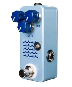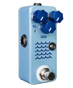¿Alguna vez has cabalgado las ondas sonoras de un tremolo vintage de un Fender blackface o Vox fluyendo como agua desde el altavoz Entonces sabes que este tipo de tono puede hacerte sentir como si estuvieras navegando en un yate de un millón de dólares. El tremolo Tidewater recrea fielmente este amado tremolo de amplificador con una calidez y carácter que solo esperarías de un amplificador vintage. Con controles simples y un tamaño reducido, estarás navegando en los mares de tono con el tremolo Tidewater. Los controles son volumen, mezcla y velocidad. El volumen te permite ajustar el volumen general a la unidad, por debajo de la unidad o por encima de la unidad para un tono mejorado. Con la mezcla completamente hacia abajo, puedes usar el Tidewater como un impulso cálido de preamplificador. La perilla de mezcla controla la profundidad del tremolo mientras que la perilla de velocidad controla qué tan rápido se mueve el tremolo, indicado por el LED junto a la perilla de velocidad. Dentro del pedal, en la parte posterior del PCB, hay tres pequeños interruptores DIP. Cuando todos los interruptores están en la posición hacia abajo, el rango de velocidad disponible es más rápido. Cuando todos los interruptores están en la posición hacia arriba, el rango disponible de velocidad es más lento. Cuando desees un tremolo simple tipo amplificador que no ocupe mucho espacio, el tremolo Tidewater es tu embarcación de elección. Este pedal requiere alimentación estándar de 9V CC negativo, consume 3 mA y mide 3.6″X1.5″X1″.