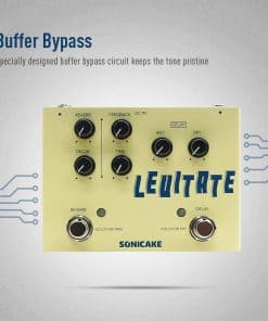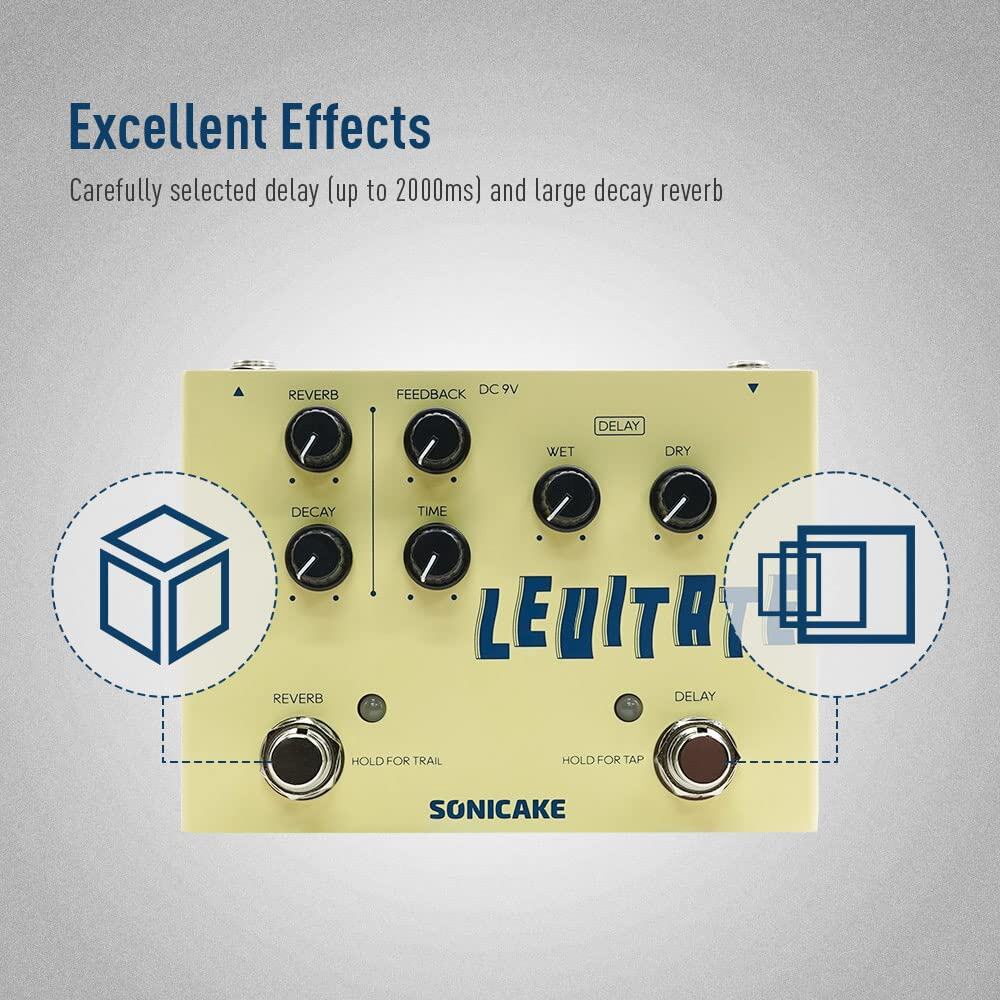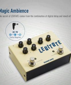 LEVITATE es un pedal de efectos dual con delay y reverb cuidadosamente seleccionados integrados. Efecto de delay de estilo digital con ajuste independiente de señal seca y señal húmeda. El reverb de placa tiene un largo tiempo de decaimiento programable. La función de Trail y tap tempo del delay ayuda durante el show en vivo. Especificaciones: Potencia: DC 9V 5.5 2.1mm centro negativo (no incluido), 92mA Dimensiones: 124(D) 90(W) 54.8(H)mm Peso: 371g Impedancia de Entrada: 470k Ohms Resistencia de Salida: 1k Ohms