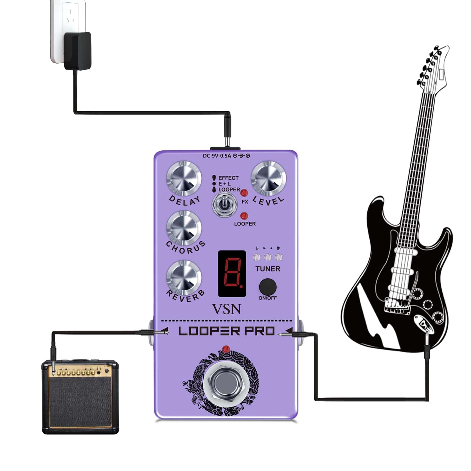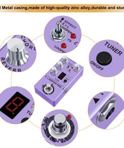 1. Pedal multi-efectos que combina Looper, Delay, Reverb, Chorus, Afinador. 2. Modo Efecto fácil de usar con ajuste de grado de efecto. 3. Modo Looper para grabar y repetir. 4. Control TUNER con pantalla nixie. 5. True Bypass para un tono transparente. 6. Adaptador de corriente no incluido.
