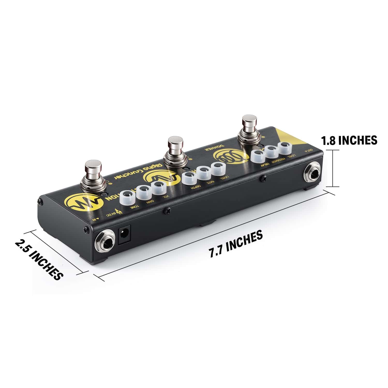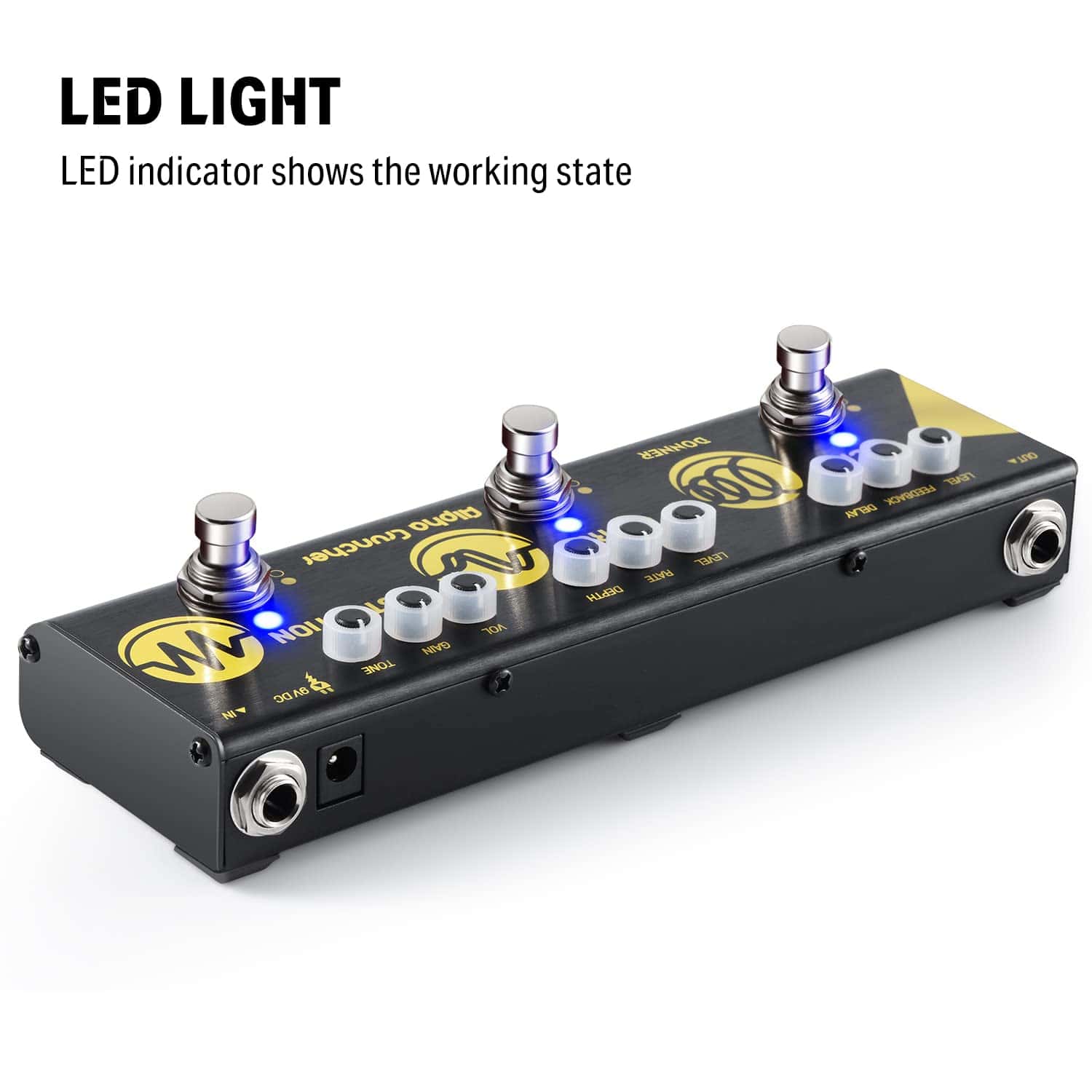3. Fácil de Controlar: Cada modo de efecto tiene tres perillas de función. Controla las tres perillas de función y elige los diferentes modelos que deseas para crear tu tono musical. El interruptor de bypass verdadero hace que la señal de tus instrumentos pase a través de una línea de bypass no electrónica. El indicador LED indica el estado de funcionamiento.