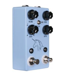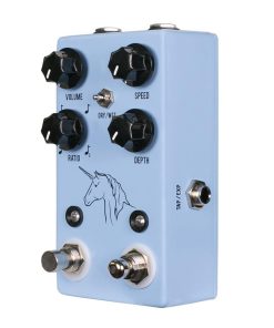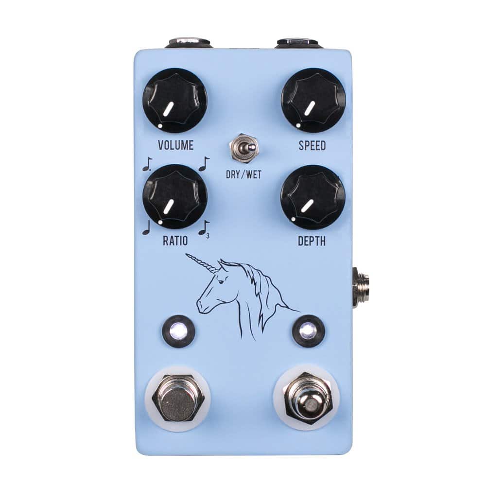 En 2015 te presentamos el Unicorn V1, el primer modulador de fotocélula accionado por bombilla con tempo de tap. Nuestro propio Uni-Vibe, por así decirlo. Esta primavera de 2018, ¡estamos orgullosos de presentarte el Unicorn V2! Las composiciones ‘Breathe’ de Pink Floyd, ‘Star Spangled Banner’ de Jimi Hendrix en Woodstock 1969 y ‘Bridge of Sighs’ de Robin Trower han consolidado el sonido de un efecto de vibrato basado en fotocélula como un estándar de la guitarra eléctrica. El JHS Pedals Unicorn es nuestra versión de este efecto tan aclamado, manteniendo los inspiradores sonidos de modulación/fase/rotación que nunca dejan de desafiar los límites musicales. Y al igual que los originales, incluimos un interruptor para elegir entre un efecto Uni-Vibe y una configuración de vibrato tradicional. Lo que distingue al Unicorn de todos los demás circuitos de estilo de vibrato es que es el primer vibrato de fotocélula totalmente analógico con tempo de tap, así como una ratio, control de tap externo y control de velocidad externo a través de pedal de expresión (opcional). Y el Unicorn hace todo esto con solo cuatro perillas y un interruptor mini-toggle. En una época en la que todo se ha visto y hecho, te presentamos el primer modulador de fotocélula de vibrato 100% analógico con tempo de tap integrado. De nada.