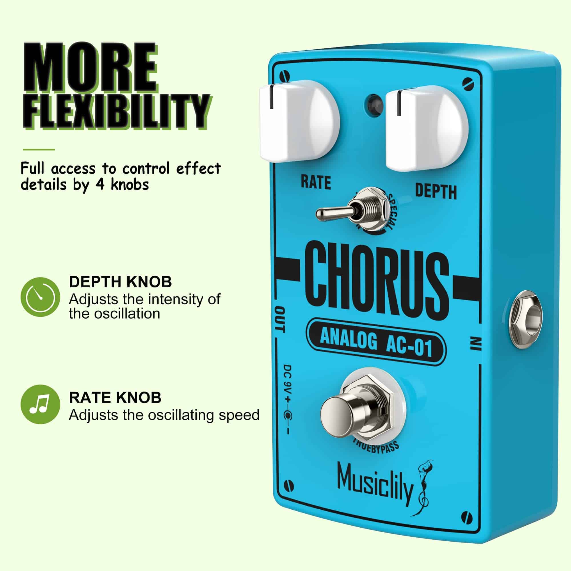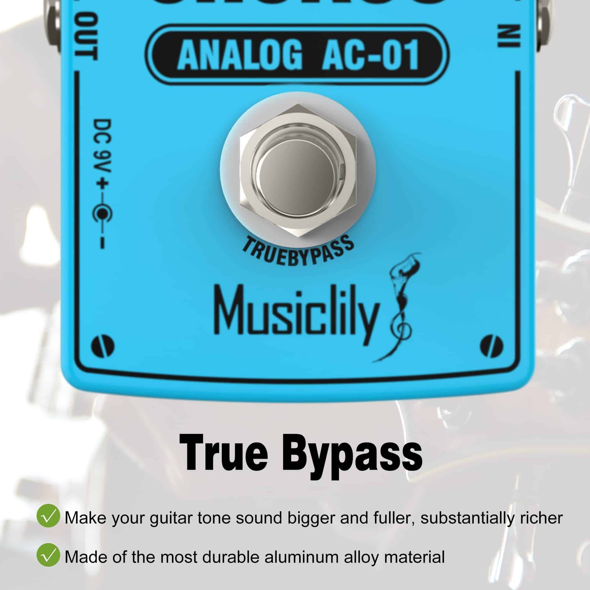 Musiclily Pro Guitar Effects Pedal es un pedal de efectos de coro super estilizado y de alta calidad para guitarra eléctrica y bajo. Este pedal ofrece un efecto de coro analógico que te permitirá experimentar una nueva dimensión en tu tono musical. Fabricado con aleación de aluminio duradera, este pedal garantiza una confiabilidad excepcional en tu tono musical. Con dos perillas de función, puedes controlar fácilmente la profundidad y la velocidad del efecto de coro para crear tu propia tonalidad musical única. El indicador LED te permite ver fácilmente el estado de funcionamiento del pedal. Su tamaño compacto y peso ligero lo hacen perfecto para conciertos al aire libre, y se alimenta con un adaptador de corriente continua de 9V (no incluido). Añade un toque de distinción y color a tu firma sonora con el pedal de efectos para guitarra Musiclily Pro DC 9V Super Chorus.